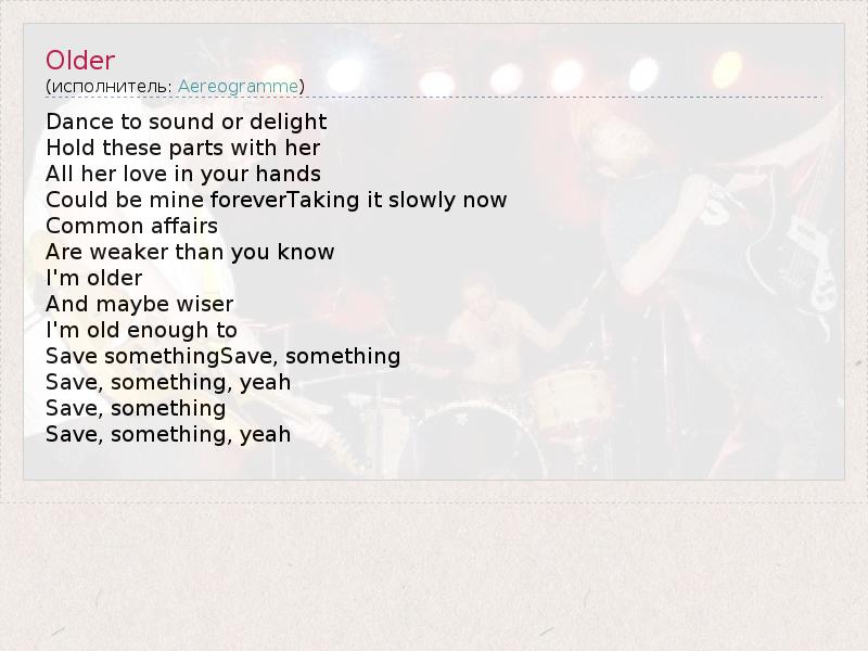 Dance to sound or delight Hold these parts with her All her love in your hands Could be mine foreverTaking it slowly now Common affairs Are weaker than you know I'm older And maybe wiser I'm old enough to Save somethingSave, something Save, something, yeah Save, something Save, something, yeah