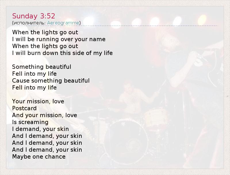 When the lights go out I will be running over your name When the lights go out I will burn down this side of my life Something beautiful Fell into my life Cause something beautiful Fell into my life Your mission, love Postcard And your mission, love Is screaming I demand, your skin And I demand, your skin And I demand, your skin And I demand, your skin Maybe one chance