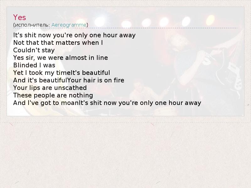 It's shit now you're only one hour away Not that that matters when I Couldn't stay Yes sir, we were almost in line Blinded I was Yet I took my timeIt's beautiful And it's beautifulYour hair is on fire Your lips are unscathed These people are nothing And I've got to moanIt's shit now you're only one hour away