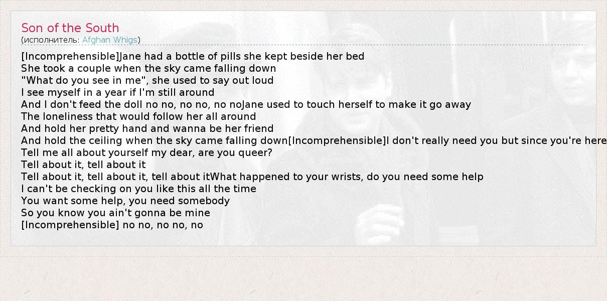 Это интересно:Afghan Whigs - американская альтернативная рок-группа. Образована в 1986 в Цинциннати (Огайо).Считается, что она принадлежит направлению гранж, но в ее музыке есть много традиционных течений: в альбоме «Uptown Avondale» присутствует много классических соул-мелодий, хотя в более раннем альбоме «Up In It» они исполняли роковые композиции в стиле кантри. Грег Далли (вокал, ритм-гитара), Рик Макколам... продолжение