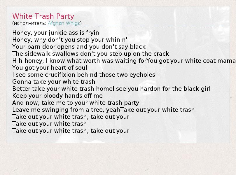 А как ты думаешь, о чем песня "White Trash Party" ?