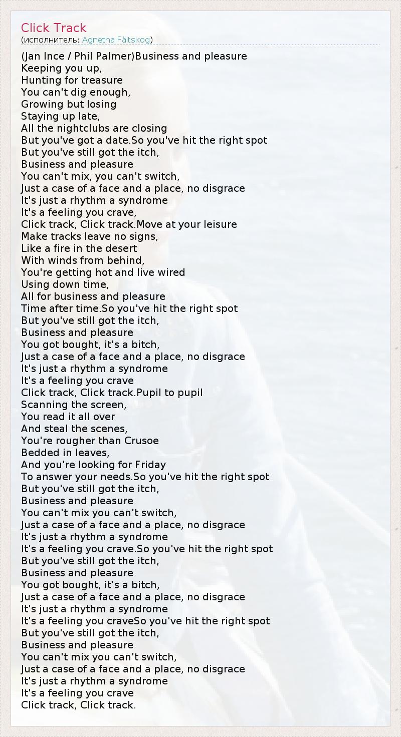 (Jan Ince / Phil Palmer)Business and pleasure Keeping you up, Hunting for treasure You can't dig enough, Growing but losing Staying up late, All the nightclubs are closing But you've got a date.So you've hit the right spot But you've still got the itch, Business and pleasure You can't mix, you can't switch, Just a case of a face and a place, no disgrace It's just a rhythm a syndrome It's a feeling you crave, Click track, Click track.Move at your leisure Make tracks leave no signs, Like a fire in the desert With winds from behind, You're getting hot and live wired Using down time, All for business and pleasure Time after time.So you've hit the right spot But you've still got the itch, Business and pleasure You got bought, it's a bitch, Just a case of a face and a place, no disgrace It's just a rhythm a syndrome It's a feeling you crave Click track, Click track.Pupil to pupil Scanning the screen, You read it all over And steal the scenes, You're rougher than Crusoe Bedded in leaves, And you're looking for Friday To answer your needs.So you've hit the right spot But you've still got the itch, Business and pleasure You can't mix you can't switch, Just a case of a face and a place, no disgrace It's just a rhythm a syndrome It's a feeling you crave.So you've hit the right spot But you've still got the itch, Business and pleasure You got bought, it's a bitch, Just a case of a face and a place, no disgrace It's just a rhythm a syndrome It's a feeling you craveSo you've hit the right spot But you've still got the itch, Business and pleasure You can't mix you can't switch, Just a case of a face and a place, no disgrace It's just a rhythm a syndrome It's a feeling you crave Click track, Click track.