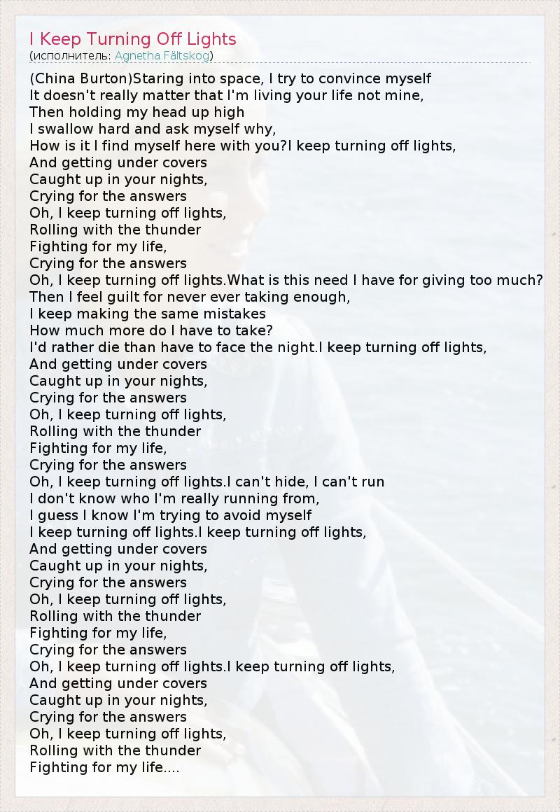 (China Burton)Staring into space, I try to convince myself It doesn't really matter that I'm living your life not mine, Then holding my head up high I swallow hard and ask myself why, How is it I find myself here with you?I keep turning off lights, And getting under covers Caught up in your nights, Crying for the answers Oh, I keep turning off lights, Rolling with the thunder Fighting for my life, Crying for the answers Oh, I keep turning off lights.What is this need I have for giving too much? Then I feel guilt for never ever taking enough, I keep making the same mistakes How much more do I have to take? I'd rather die than have to face the night.I keep turning off lights, And getting under covers Caught up in your nights, Crying for the answers Oh, I keep turning off lights, Rolling with the thunder Fighting for my life, Crying for the answers Oh, I keep turning off lights.I can't hide, I can't run I don't know who I'm really running from, I guess I know I'm trying to avoid myself I keep turning off lights.I keep turning off lights, And getting under covers Caught up in your nights, Crying for the answers Oh, I keep turning off lights, Rolling with the thunder Fighting for my life, Crying for the answers Oh, I keep turning off lights.I keep turning off lights, And getting under covers Caught up in your nights, Crying for the answers Oh, I keep turning off lights, Rolling with the thunder Fighting for my life....