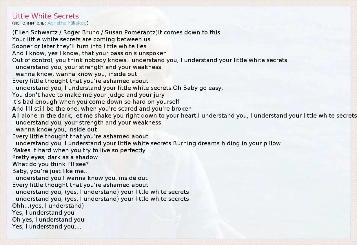 (Ellen Schwartz / Roger Bruno / Susan Pomerantz)It comes down to this Your little white secrets are coming between us Sooner or later they'll turn into little white lies And I know, yes I know, that your passion's unspoken Out of control, you think nobody knows.I understand you, I understand your little white secrets I understand you, your strength and your weakness I wanna know, wanna know you, inside out Every little thought that you're ashamed about I understand you, I understand your little white secrets.Oh Baby go easy, You don't have to make me your judge and your jury It's bad enough when you come down so hard on yourself And I'll still be the one, when you're scared and you're broken All alone in the dark, let me shake you right down to your heart.I understand you, I understand your little white secrets I understand you, your strength and your weakness I wanna know you, inside out Every little thought that you're ashamed about I understand you, I understand your little white secrets.Burning dreams hiding in your pillow Makes it hard when you try to live so perfectly Pretty eyes, dark as a shadow What do you think I'll see? Baby, you're just like me... I understand you.I wanna know you, inside out Every little thought that you're ashamed about I understand you, (yes, I understand) your little white secrets I understand you, (yes, I understand) your little white secrets Ohh...(yes, I understand) Yes, I understand you Oh yes, I understand you Yes, I understand you....
