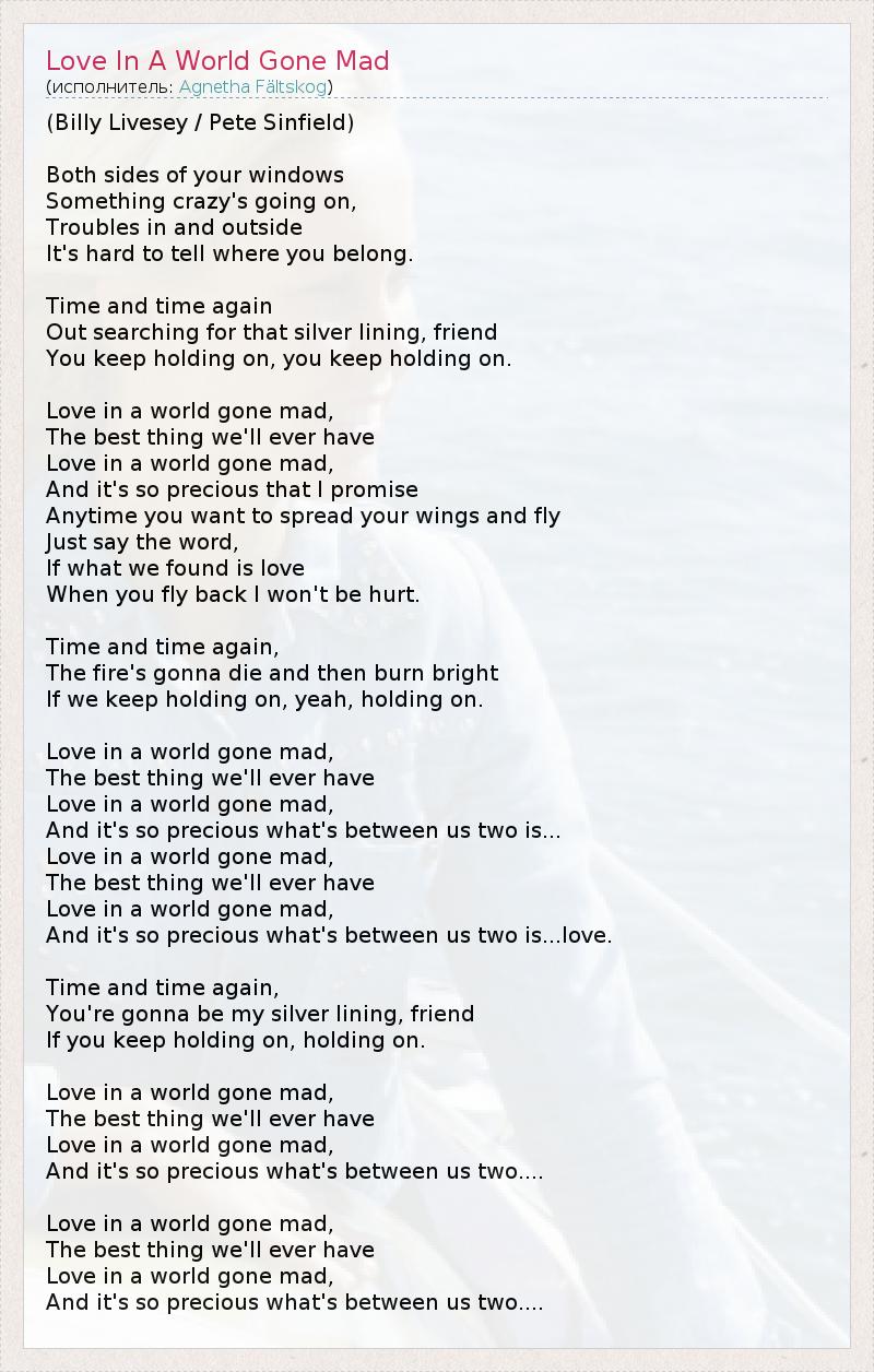 (Billy Livesey / Pete Sinfield) Both sides of your windows Something crazy's going on, Troubles in and outside It's hard to tell where you belong. Time and time again Out searching for that silver lining, friend You keep holding on, you keep holding on. Love in a world gone mad, The best thing we'll ever have Love in a world gone mad, And it's so precious that I promise Anytime you want to spread your wings and fly Just say the word, If what we found is love When you fly back I won't be hurt. Time and time again, The fire's gonna die and then burn bright If we keep holding on, yeah, holding on. Love in a world gone mad, The best thing we'll ever have Love in a world gone mad, And it's so precious what's between us two is... Love in a world gone mad, The best thing we'll ever have Love in a world gone mad, And it's so precious what's between us two is...love. Time and time again, You're gonna be my silver lining, friend If you keep holding on, holding on. Love in a world gone mad, The best thing we'll ever have Love in a world gone mad, And it's so precious what's between us two.... Love in a world gone mad, The best thing we'll ever have Love in a world gone mad, And it's so precious what's between us two....