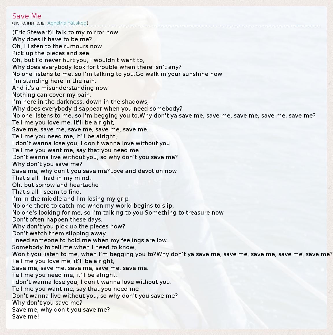 (Eric Stewart)I talk to my mirror now Why does it have to be me? Oh, I listen to the rumours now Pick up the pieces and see. Oh, but I'd never hurt you, I wouldn't want to, Why does everybody look for trouble when there isn't any? No one listens to me, so I'm talking to you.Go walk in your sunshine now I'm standing here in the rain. And it's a misunderstanding now Nothing can cover my pain. I'm here in the darkness, down in the shadows, Why does everybody disappear when you need somebody? No one listens to me, so I'm begging you to.Why don't ya save me, save me, save me, save me, save me? Tell me you love me, it'll be alright, Save me, save me, save me, save me, save me. Tell me you need me, it'll be alright, I don't wanna lose you, I don't wanna love without you. Tell me you want me, say that you need me Don't wanna live without you, so why don't you save me? Why don't you save me? Save me, why don't you save me?Love and devotion now That's all I had in my mind. Oh, but sorrow and heartache That's all I seem to find. I'm in the middle and I'm losing my grip No one there to catch me when my world begins to slip, No one's looking for me, so I'm talking to you.Something to treasure now Don't often happen these days. Why don't you pick up the pieces now? Don't watch them slipping away. I need someone to hold me when my feelings are low Somebody to tell me when I need to know, Won't you listen to me, when I'm begging you to?Why don't ya save me, save me, save me, save me, save me? Tell me you love me, it'll be alright, Save me, save me, save me, save me, save me. Tell me you need me, it'll be alright, I don't wanna lose you, I don't wanna love without you. Tell me you want me, say that you need me Don't wanna live without you, so why don't you save me? Why don't you save me? Save me, why don't you save me? Save me!