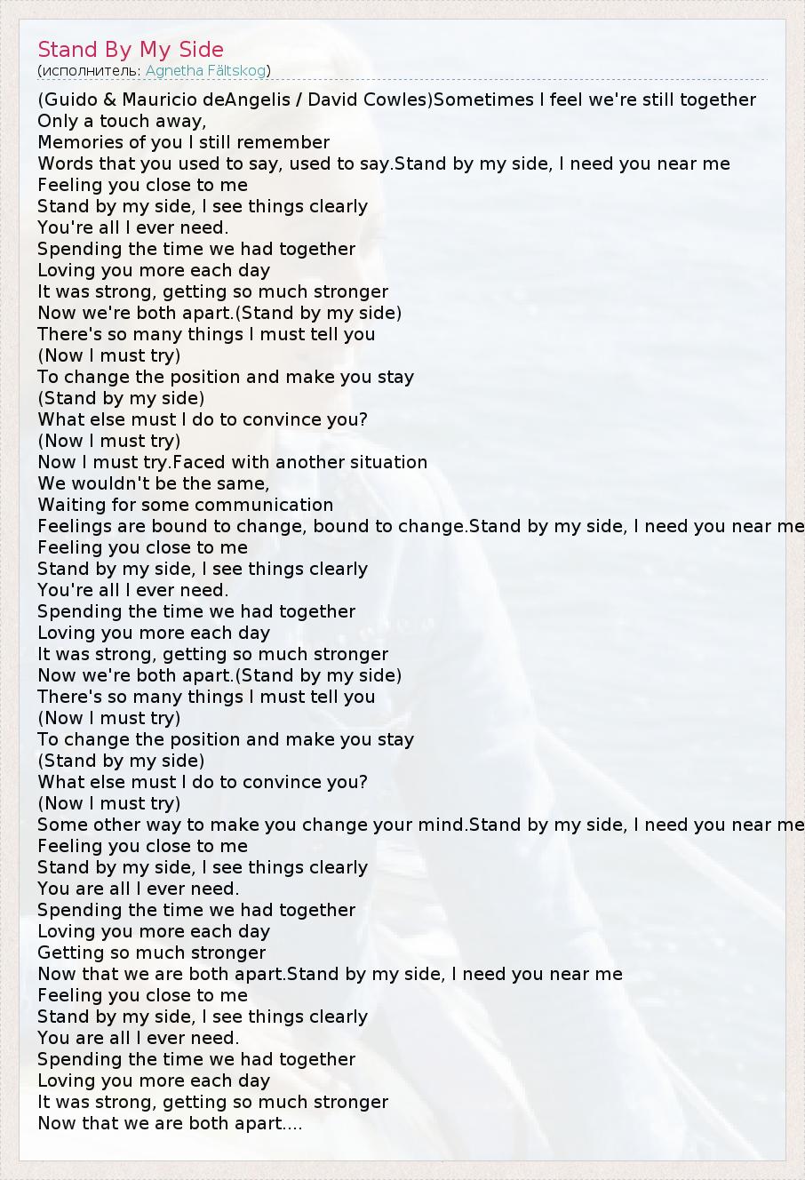 (Guido & Mauricio deAngelis / David Cowles)Sometimes I feel we're still together Only a touch away, Memories of you I still remember Words that you used to say, used to say.Stand by my side, I need you near me Feeling you close to me Stand by my side, I see things clearly You're all I ever need. Spending the time we had together Loving you more each day It was strong, getting so much stronger Now we're both apart.(Stand by my side) There's so many things I must tell you (Now I must try) To change the position and make you stay (Stand by my side) What else must I do to convince you? (Now I must try) Now I must try.Faced with another situation We wouldn't be the same, Waiting for some communication Feelings are bound to change, bound to change.Stand by my side, I need you near me Feeling you close to me Stand by my side, I see things clearly You're all I ever need. Spending the time we had together Loving you more each day It was strong, getting so much stronger Now we're both apart.(Stand by my side) There's so many things I must tell you (Now I must try) To change the position and make you stay (Stand by my side) What else must I do to convince you? (Now I must try) Some other way to make you change your mind.Stand by my side, I need you near me Feeling you close to me Stand by my side, I see things clearly You are all I ever need. Spending the time we had together Loving you more each day Getting so much stronger Now that we are both apart.Stand by my side, I need you near me Feeling you close to me Stand by my side, I see things clearly You are all I ever need. Spending the time we had together Loving you more each day It was strong, getting so much stronger Now that we are both apart....