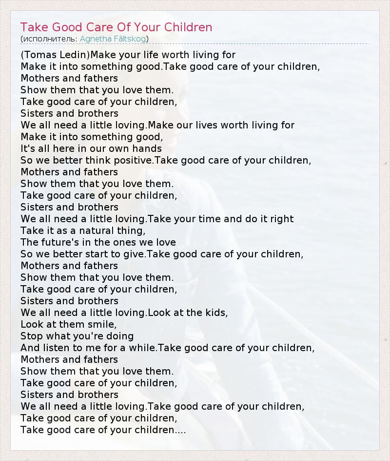 (Tomas Ledin)Make your life worth living for Make it into something good.Take good care of your children, Mothers and fathers Show them that you love them. Take good care of your children, Sisters and brothers We all need a little loving.Make our lives worth living for Make it into something good, It's all here in our own hands So we better think positive.Take good care of your children, Mothers and fathers Show them that you love them. Take good care of your children, Sisters and brothers We all need a little loving.Take your time and do it right Take it as a natural thing, The future's in the ones we love So we better start to give.Take good care of your children, Mothers and fathers Show them that you love them. Take good care of your children, Sisters and brothers We all need a little loving.Look at the kids, Look at them smile, Stop what you're doing And listen to me for a while.Take good care of your children, Mothers and fathers Show them that you love them. Take good care of your children, Sisters and brothers We all need a little loving.Take good care of your children, Take good care of your children, Take good care of your children....