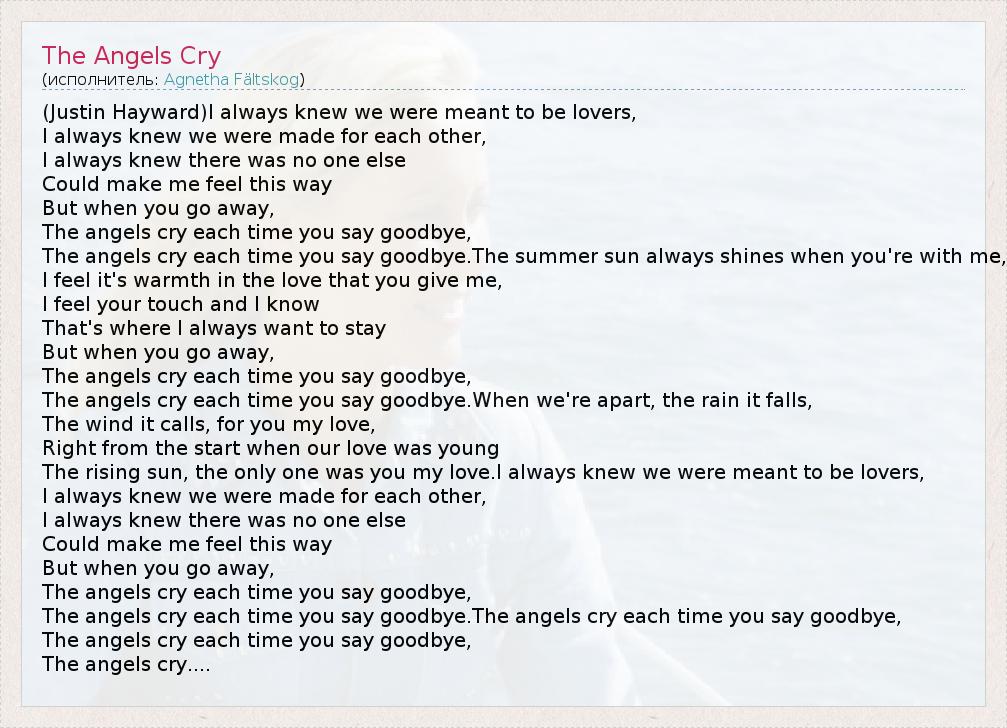 (Justin Hayward)I always knew we were meant to be lovers, I always knew we were made for each other, I always knew there was no one else Could make me feel this way But when you go away, The angels cry each time you say goodbye, The angels cry each time you say goodbye.The summer sun always shines when you're with me, I feel it's warmth in the love that you give me, I feel your touch and I know That's where I always want to stay But when you go away, The angels cry each time you say goodbye, The angels cry each time you say goodbye.When we're apart, the rain it falls, The wind it calls, for you my love, Right from the start when our love was young The rising sun, the only one was you my love.I always knew we were meant to be lovers, I always knew we were made for each other, I always knew there was no one else Could make me feel this way But when you go away, The angels cry each time you say goodbye, The angels cry each time you say goodbye.The angels cry each time you say goodbye, The angels cry each time you say goodbye, The angels cry....