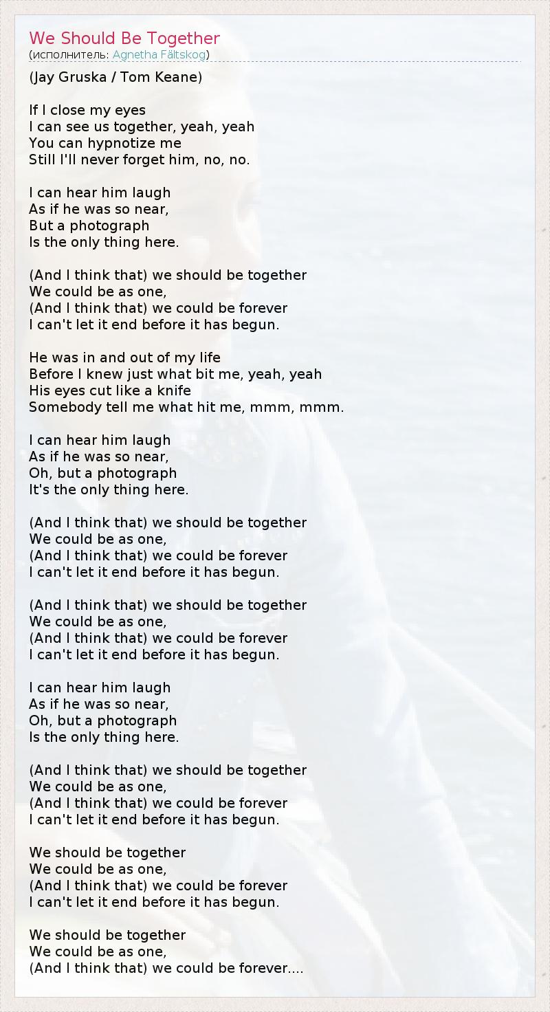 (Jay Gruska / Tom Keane) If I close my eyes I can see us together, yeah, yeah You can hypnotize me Still I'll never forget him, no, no. I can hear him laugh As if he was so near, But a photograph Is the only thing here. (And I think that) we should be together We could be as one, (And I think that) we could be forever I can't let it end before it has begun. He was in and out of my life Before I knew just what bit me, yeah, yeah His eyes cut like a knife Somebody tell me what hit me, mmm, mmm. I can hear him laugh As if he was so near, Oh, but a photograph It's the only thing here. (And I think that) we should be together We could be as one, (And I think that) we could be forever I can't let it end before it has begun. (And I think that) we should be together We could be as one, (And I think that) we could be forever I can't let it end before it has begun. I can hear him laugh As if he was so near, Oh, but a photograph Is the only thing here. (And I think that) we should be together We could be as one, (And I think that) we could be forever I can't let it end before it has begun. We should be together We could be as one, (And I think that) we could be forever I can't let it end before it has begun. We should be together We could be as one, (And I think that) we could be forever....