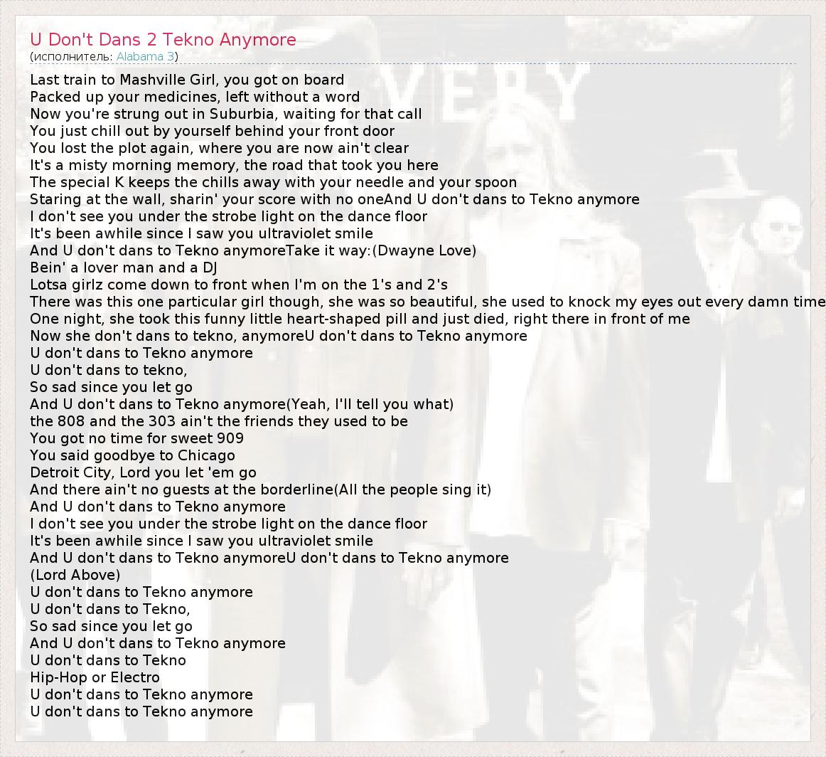 ГлавнаяИсполнителиAlabama 3U Don't Dans 2 Tekno Anymore