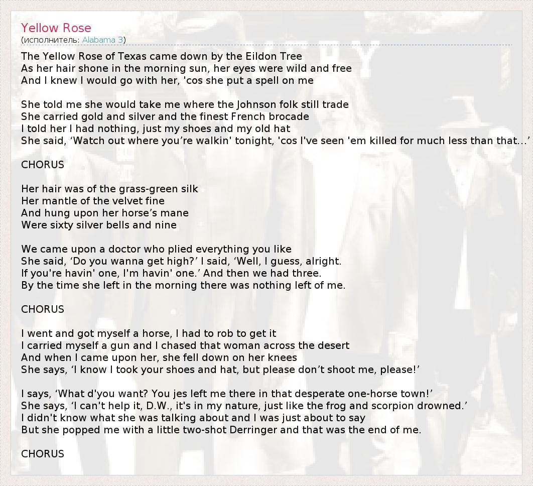 Желтая роза Техаса сошел на Eildon Tree Поскольку ее волосы сияли в лучах утреннего солнца, глаза были дикими и свободными И я знал, я бы с ней, 'потому что она околдовала меня Она рассказала мне, что она примет меня, где народная Джонсон все еще торгуют Она несла золото и серебро и лучших французских парчу Я сказал ей, ничего не было, просто мои туфли и мою старую шляпу Она сказала: "Берегись, где вы ходьба пешком сегодня, потому что я видел 'Em убиты за гораздо меньше, чем ..." ХОР Ее волосы были в травянисто-зеленый шелк Ее мантия бархатного штрафа И висел на гриву ее лошади Были шестьдесят серебряных колокольчиков и девять Мы пришли на врача, который курсировали все, что вы хотели Она сказала: «Хочешь получить высокое?» Я сказал: «Ну, я думаю, хорошо. Если вы Хавин один, я Хавин один. А потом у нас было три. К тому времени она вышла утром не было ничего от меня осталось. ХОР Я пошел и получил себе лошадь, я должен был лишить его получить Я нес себе пистолет и я преследовал эту женщину через пустыню И когда я пришел на нее, она упала на колени Она говорит: «Я знаю, что принял свои ботинки и шапку, но, пожалуйста, не стреляйте в меня, пожалуйста!" Я сказал: «Что ты хочешь? Вы Jes оставил меня там, в этом отчаянном однолошадного городе! ' Она говорит: "Я не могу с собой поделать, D.W., это в моей природе, так же, как лягушки и скорпион утонул. Я не знаю, что она имела в виду, и я как раз собирался сказать Но она снова поднял меня с небольшим два выстрела Derringer и что был конец меня. ХОР