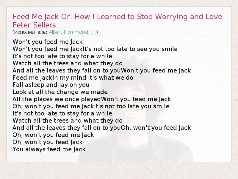 А как ты думаешь, о чем песня "Feed Me Jack Or: How I Learned to Stop Worrying and Love Peter Sellers" ?