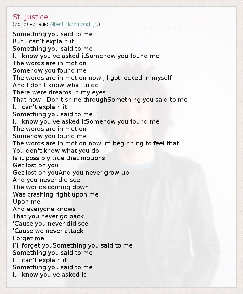 Something you said to me But I can't explain it Something you said to me I, I know you've asked itSomehow you found me The words are in motion Somehow you found me The words are in motion nowI, I got locked in myself And I don't know what to do There were dreams in my eyes That now - Don't shine throughSomething you said to me I, I can't explain it Something you said to me I, I know you've asked itSomehow you found me The words are in motion Somehow you found me The words are in motion nowI'm beginning to feel that You don't know what you do Is it possibly true that motions Get lost on you Get lost on youAnd you never grow up And you never did see The worlds coming down Was crashing right upon me Upon me And everyone knows That you never go back 'Cause you never did see 'Cause we never attack Forget me I'll forget youSomething you said to me Something you said to me I, I can't explain it Something you said to me I, I know you've asked it
