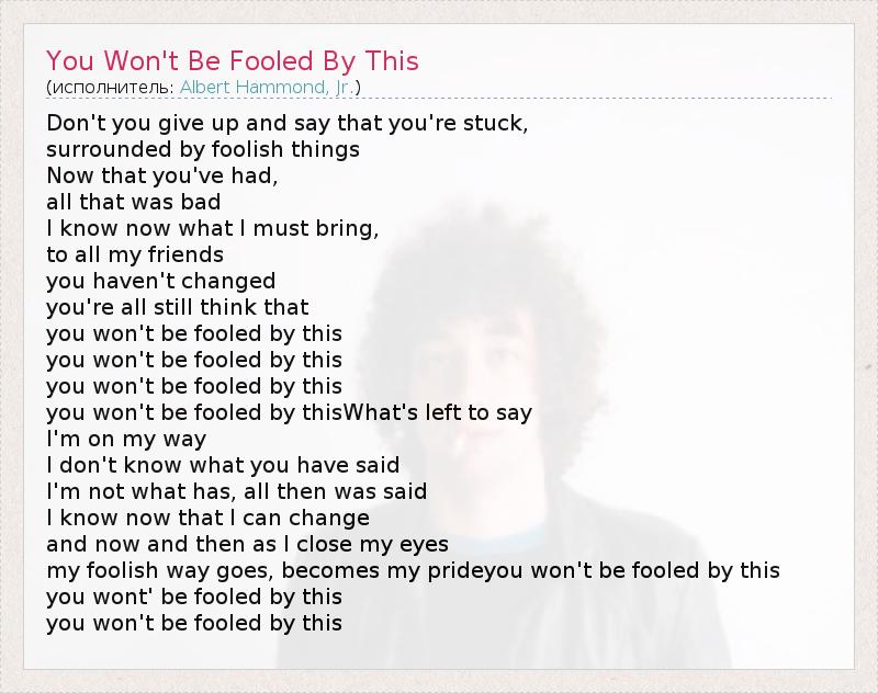 Don't you give up and say that you're stuck, surrounded by foolish things Now that you've had, all that was bad I know now what I must bring, to all my friends you haven't changed you're all still think that you won't be fooled by this you won't be fooled by this you won't be fooled by this you won't be fooled by thisWhat's left to say I'm on my way I don't know what you have said I'm not what has, all then was said I know now that I can change and now and then as I close my eyes my foolish way goes, becomes my prideyou won't be fooled by this you wont' be fooled by this you won't be fooled by this