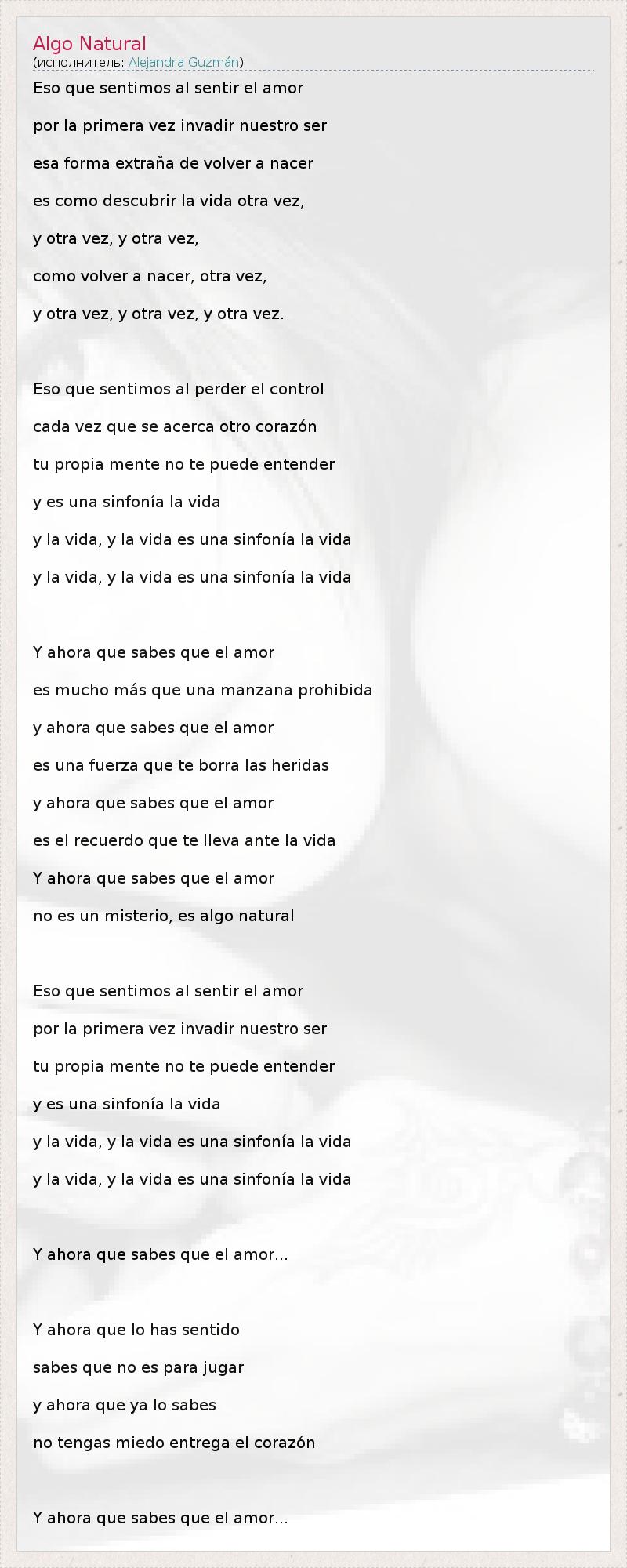 Eso que sentimos al sentir el amor por la primera vez invadir nuestro ser esa forma extraña de volver a nacer es como descubrir la vida otra vez, y otra vez, y otra vez, como volver a nacer, otra vez, y otra vez, y otra vez, y otra vez. Eso que sentimos al perder el control cada vez que se acerca otro corazón tu propia mente no te puede entender y es una sinfonía la vida y la vida, y la vida es una sinfonía la vida y la vida, y la vida es una sinfonía la vida Y ahora que sabes que el amor es mucho más que una manzana prohibida y ahora que sabes que el amor es una fuerza que te borra las heridas y ahora que sabes que el amor es el recuerdo que te lleva ante la vida Y ahora que sabes que el amor no es un misterio, es algo natural Eso que sentimos al sentir el amor por la primera vez invadir nuestro ser tu propia mente no te puede entender y es una sinfonía la vida y la vida, y la vida es una sinfonía la vida y la vida, y la vida es una sinfonía la vida Y ahora que sabes que el amor... Y ahora que lo has sentido sabes que no es para jugar y ahora que ya lo sabes no tengas miedo entrega el corazón Y ahora que sabes que el amor...