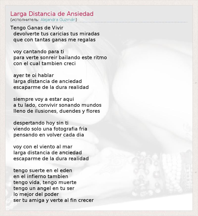 Tengo Ganas de Vivir devolverte tus caricias tus miradas que con tantas ganas me regalas voy cantando para ti para verte sonreir bailando este ritmo con el cual tambien creci ayer te oi hablar larga distancia de anciedad escaparme de la dura realidad siempre voy a estar aqui a tu lado, convivir sonando mundos lleno de ilusiones, duendes y flores despertando hoy sin ti viendo solo una fotografia fria pensando en volver cada dia voy con el viento al mar larga distancia de anciedad escaparme de la dura realidad tengo suerte en el eden en el infierno tambien tengo vida, tengo muerte tengo un angel en tu ser lo mejor del poder ser tu amiga y verte al fin crecer