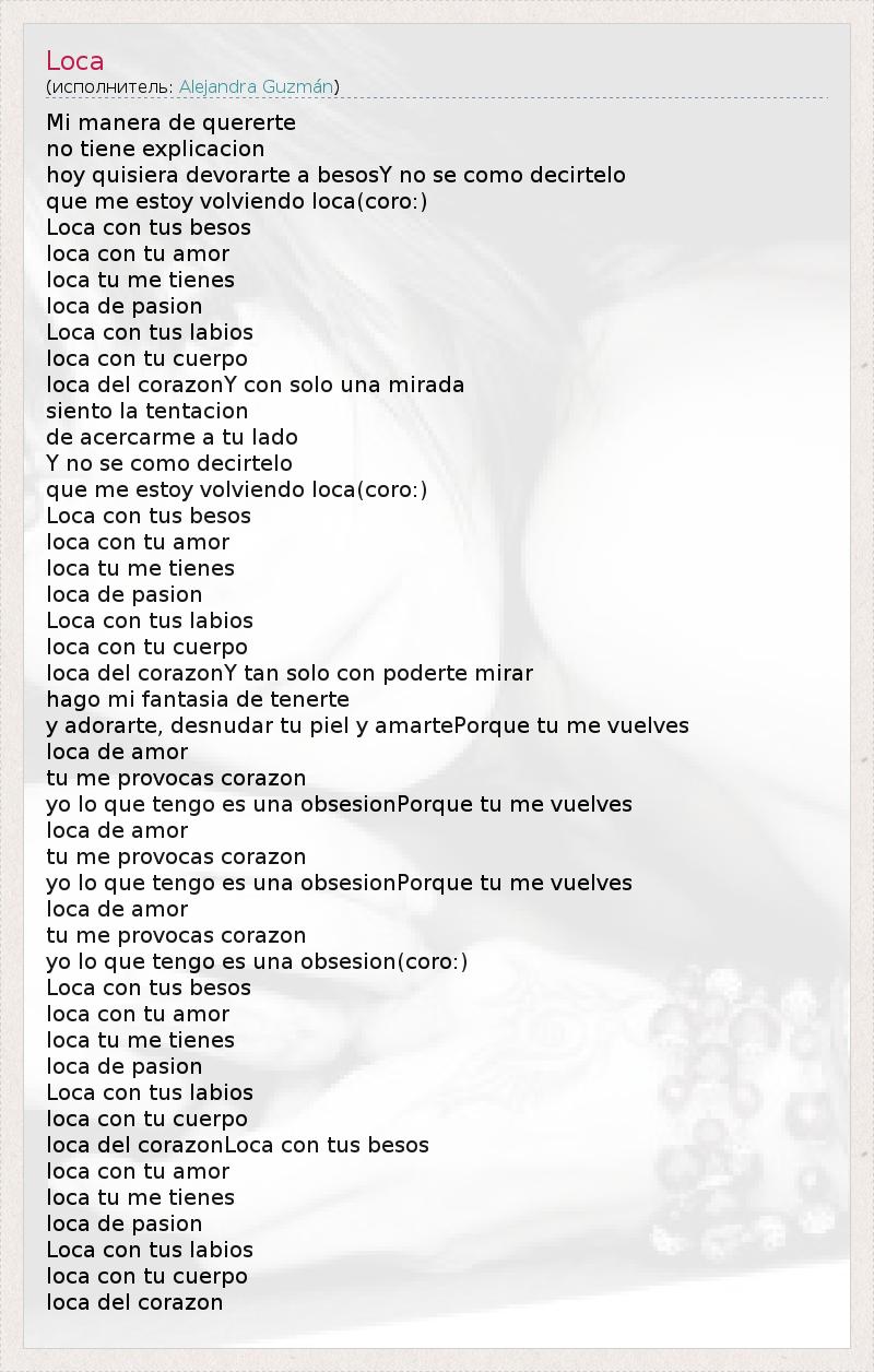 Mi manera de quererte no tiene explicacion hoy quisiera devorarte a besosY no se como decirtelo que me estoy volviendo loca(coro:) Loca con tus besos loca con tu amor loca tu me tienes loca de pasion Loca con tus labios loca con tu cuerpo loca del corazonY con solo una mirada siento la tentacion de acercarme a tu lado Y no se como decirtelo que me estoy volviendo loca(coro:) Loca con tus besos loca con tu amor loca tu me tienes loca de pasion Loca con tus labios loca con tu cuerpo loca del corazonY tan solo con poderte mirar hago mi fantasia de tenerte y adorarte, desnudar tu piel y amartePorque tu me vuelves loca de amor tu me provocas corazon yo lo que tengo es una obsesionPorque tu me vuelves loca de amor tu me provocas corazon yo lo que tengo es una obsesionPorque tu me vuelves loca de amor tu me provocas corazon yo lo que tengo es una obsesion(coro:) Loca con tus besos loca con tu amor loca tu me tienes loca de pasion Loca con tus labios loca con tu cuerpo loca del corazonLoca con tus besos loca con tu amor loca tu me tienes loca de pasion Loca con tus labios loca con tu cuerpo loca del corazon