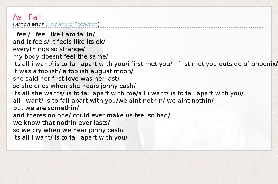 i feel/ i feel like i am fallin/ and it feels/ it feels like its ok/ everythings so strange/ my body doesnt feel the same/ its all i want/ is to fall apart with you/i first met you/ i first met you outside of phoenix/ it was a foolish/ a foolish august moon/ she said her first love was her last/ so she cries when she hears jonny cash/ its all she wants/ is to fall apart with me/all i want/ is to fall apart with you/ all i want/ is to fall apart with you/we aint nothin/ we aint nothin/ but we are somethin/ and theres no one/ could ever make us feel so bad/ we know that nothin ever lasts/ so we cry when we hear jonny cash/ its all i want/ is to fall apart with you/