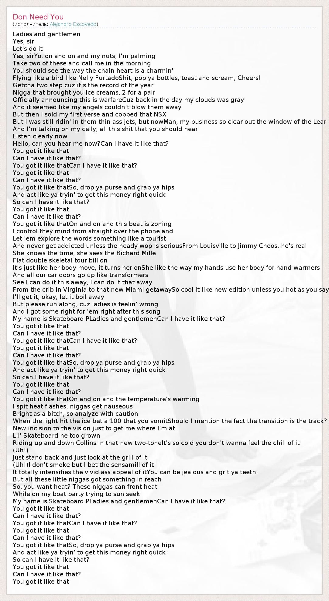 Ladies and gentlemen Yes, sir Let's do it Yes, sirYo, on and on and my nuts, I'm palming Take two of these and call me in the morning You should see the way the chain heart is a charmin' Flying like a bird like Nelly FurtadoShit, pop ya bottles, toast and scream, Cheers! Getcha two step cuz it's the record of the year Nigga that brought you ice creams, 2 for a pair Officially announcing this is warfareCuz back in the day my clouds was gray And it seemed like my angels couldn't blow them away But then I sold my first verse and copped that NSX But I was still ridin' in them thin ass jets, but nowMan, my business so clear out the window of the Lear And I'm talking on my celly, all this shit that you should hear Listen clearly now Hello, can you hear me now?Can I have it like that? You got it like that Can I have it like that? You got it like thatCan I have it like that? You got it like that Can I have it like that? You got it like thatSo, drop ya purse and grab ya hips And act like ya tryin' to get this money right quick So can I have it like that? You got it like that Can I have it like that? You got it like thatOn and on and this beat is zoning I control they mind from straight over the phone and Let 'em explore the words something like a tourist And never get addicted unless the heady wop is seriousFrom Louisville to Jimmy Choos, he's real She knows the time, she sees the Richard Mille Flat double skeletal tour billion It's just like her body move, it turns her onShe like the way my hands use her body for hand warmers And all our car doors go up like transformers See I can do it this away, I can do it that away From the crib in Virginia to that new Miami getawaySo cool it like new edition unless you hot as you say I'll get it, okay, let it boil away But please run along, cuz ladies is feelin' wrong And I got some right for 'em right after this song My name is Skateboard PLadies and gentlemenCan I have it like that? You got it like that Can I have it like that? You got it like thatCan I have it like that? You got it like that Can I have it like that? You got it like thatSo, drop ya purse and grab ya hips And act like ya tryin' to get this money right quick So can I have it like that? You got it like that Can I have it like that? You got it like thatOn and on and the temperature's warming I spit heat flashes, niggas get nauseous Bright as a bitch, so analyze with caution When the light hit the ice bet a 100 that you vomitShould I mention the fact the transition is the track? New incision to the vision just to get me where I'm at Lil' Skateboard he too grown Riding up and down Collins in that new two-toneIt's so cold you don't wanna feel the chill of it (Uh!) Just stand back and just look at the grill of it (Uh!)I don't smoke but I bet the sensamill of it It totally intensifies the vivid ass appeal of itYou can be jealous and grit ya teeth But all these little niggas got something in reach So, you want heat? These niggas can front heat While on my boat party trying to sun seek My name is Skateboard PLadies and gentlemenCan I have it like that? You got it like that Can I have it like that? You got it like thatCan I have it like that? You got it like that Can I have it like that? You got it like thatSo, drop ya purse and grab ya hips And act like ya tryin' to get this money right quick So can I have it like that? You got it like that Can I have it like that? You got it like that