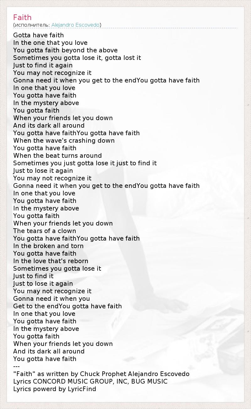 Gotta have faith In the one that you love You gotta faith beyond the above Sometimes you gotta lose it, gotta lost it Just to find it again You may not recognize it Gonna need it when you get to the endYou gotta have faith In one that you love You gotta have faith In the mystery above You gotta faith When your friends let you down And its dark all around You gotta have faithYou gotta have faith When the wave's crashing down You gotta have faith When the beat turns around Sometimes you just gotta lose it just to find it Just to lose it again You may not recognize it Gonna need it when you get to the endYou gotta have faith In one that you love You gotta have faith In the mystery above You gotta faith When your friends let you down The tears of a clown You gotta have faithYou gotta have faith In the broken and torn You gotta have faith In the love that's reborn Sometimes you gotta lose it Just to find it Just to lose it again You may not recognize it Gonna need it when you Get to the endYou gotta have faith In one that you love You gotta have faith In the mystery above You gotta faith When your friends let you down And its dark all around You gotta have faith --- "Faith" as written by Chuck Prophet Alejandro Escovedo Lyrics CONCORD MUSIC GROUP, INC, BUG MUSIC Lyrics powerd by LyricFind
