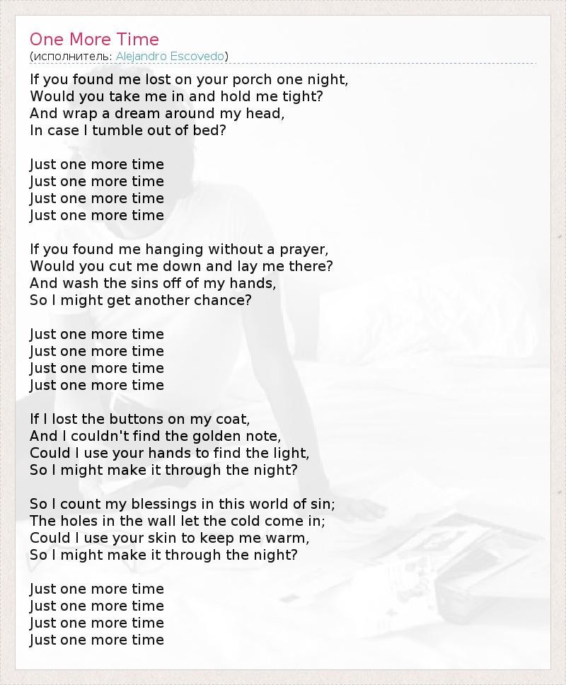 If you found me lost on your porch one night, Would you take me in and hold me tight? And wrap a dream around my head, In case I tumble out of bed? Just one more time Just one more time Just one more time Just one more time If you found me hanging without a prayer, Would you cut me down and lay me there? And wash the sins off of my hands, So I might get another chance? Just one more time Just one more time Just one more time Just one more time If I lost the buttons on my coat, And I couldn't find the golden note, Could I use your hands to find the light, So I might make it through the night? So I count my blessings in this world of sin; The holes in the wall let the cold come in; Could I use your skin to keep me warm, So I might make it through the night? Just one more time Just one more time Just one more time Just one more time
