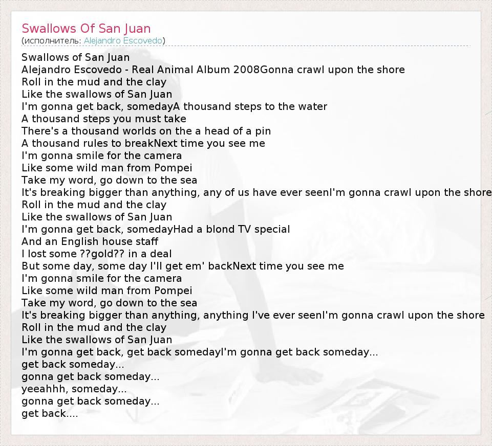 Swallows of San Juan Alejandro Escovedo - Real Animal Album 2008Gonna crawl upon the shore Roll in the mud and the clay Like the swallows of San Juan I'm gonna get back, somedayA thousand steps to the water A thousand steps you must take There's a thousand worlds on the a head of a pin A thousand rules to breakNext time you see me I'm gonna smile for the camera Like some wild man from Pompei Take my word, go down to the sea It's breaking bigger than anything, any of us have ever seenI'm gonna crawl upon the shore Roll in the mud and the clay Like the swallows of San Juan I'm gonna get back, somedayHad a blond TV special And an English house staff I lost some ??gold?? in a deal But some day, some day I'll get em' backNext time you see me I'm gonna smile for the camera Like some wild man from Pompei Take my word, go down to the sea It's breaking bigger than anything, anything I've ever seenI'm gonna crawl upon the shore Roll in the mud and the clay Like the swallows of San Juan I'm gonna get back, get back somedayI'm gonna get back someday... get back someday... gonna get back someday... yeeahhh, someday... gonna get back someday... get back....