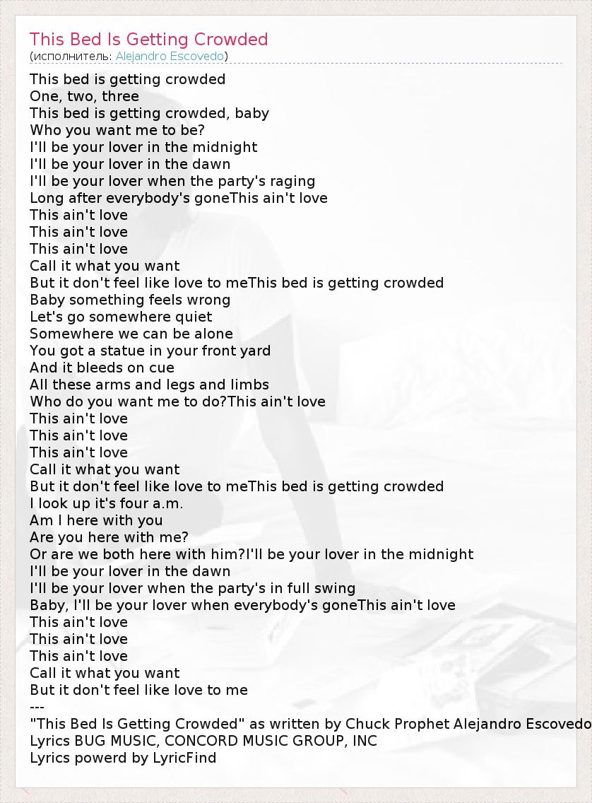 This bed is getting crowded One, two, three This bed is getting crowded, baby Who you want me to be? I'll be your lover in the midnight I'll be your lover in the dawn I'll be your lover when the party's raging Long after everybody's goneThis ain't love This ain't love This ain't love This ain't love Call it what you want But it don't feel like love to meThis bed is getting crowded Baby something feels wrong Let's go somewhere quiet Somewhere we can be alone You got a statue in your front yard And it bleeds on cue All these arms and legs and limbs Who do you want me to do?This ain't love This ain't love This ain't love This ain't love Call it what you want But it don't feel like love to meThis bed is getting crowded I look up it's four a.m. Am I here with you Are you here with me? Or are we both here with him?I'll be your lover in the midnight I'll be your lover in the dawn I'll be your lover when the party's in full swing Baby, I'll be your lover when everybody's goneThis ain't love This ain't love This ain't love This ain't love Call it what you want But it don't feel like love to me --- "This Bed Is Getting Crowded" as written by Chuck Prophet Alejandro Escovedo Lyrics BUG MUSIC, CONCORD MUSIC GROUP, INC Lyrics powerd by LyricFind