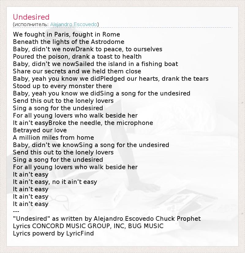 We fought in Paris, fought in Rome Beneath the lights of the Astrodome Baby, didn't we nowDrank to peace, to ourselves Poured the poison, drank a toast to health Baby, didn't we nowSailed the island in a fishing boat Share our secrets and we held them close Baby, yeah you know we didPledged our hearts, drank the tears Stood up to every monster there Baby, yeah you know we didSing a song for the undesired Send this out to the lonely lovers Sing a song for the undesired For all young lovers who walk beside her It ain't easyBroke the needle, the microphone Betrayed our love A million miles from home Baby, didn't we knowSing a song for the undesired Send this out to the lonely lovers Sing a song for the undesired For all young lovers who walk beside her It ain't easy It ain't easy, no it ain't easy It ain't easy It ain't easy It ain't easy --- "Undesired" as written by Alejandro Escovedo Chuck Prophet Lyrics CONCORD MUSIC GROUP, INC, BUG MUSIC Lyrics powerd by LyricFind