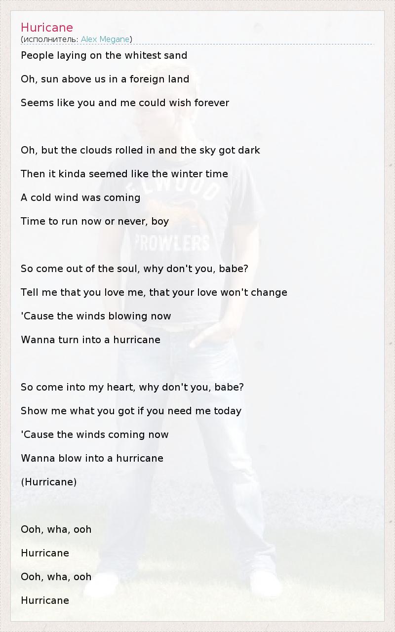 People laying on the whitest sand Oh, sun above us in a foreign land Seems like you and me could wish forever Oh, but the clouds rolled in and the sky got dark Then it kinda seemed like the winter time A cold wind was coming Time to run now or never, boy So come out of the soul, why don't you, babe? Tell me that you love me, that your love won't change 'Cause the winds blowing now Wanna turn into a hurricane So come into my heart, why don't you, babe? Show me what you got if you need me today 'Cause the winds coming now Wanna blow into a hurricane (Hurricane) Ooh, wha, ooh Hurricane Ooh, wha, ooh Hurricane