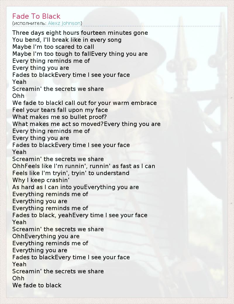 Three days eight hours fourteen minutes gone You bend, I'll break like in every song Maybe I'm too scared to call Maybe I'm too tough to fallEvery thing you are Every thing reminds me of Every thing you are Fades to blackEvery time I see your face Yeah Screamin' the secrets we share Ohh We fade to blackI call out for your warm embrace Feel your tears fall upon my face What makes me so bullet proof? What makes me act so moved?Every thing you are Every thing reminds me of Every thing you are Fades to blackEvery time I see your face Yeah Screamin' the secrets we share OhhFeels like I'm runnin', runnin' as fast as I can Feels like I'm tryin', tryin' to understand Why I keep crashin' As hard as I can into youEverything you are Everything reminds me of Everything you are Everything reminds me of Fades to black, yeahEvery time I see your face Yeah Screamin' the secrets we share OhhEverything you are Everything reminds me of Everything you are Fades to blackEvery time I see your face Yeah Screamin' the secrets we share Ohh We fade to black