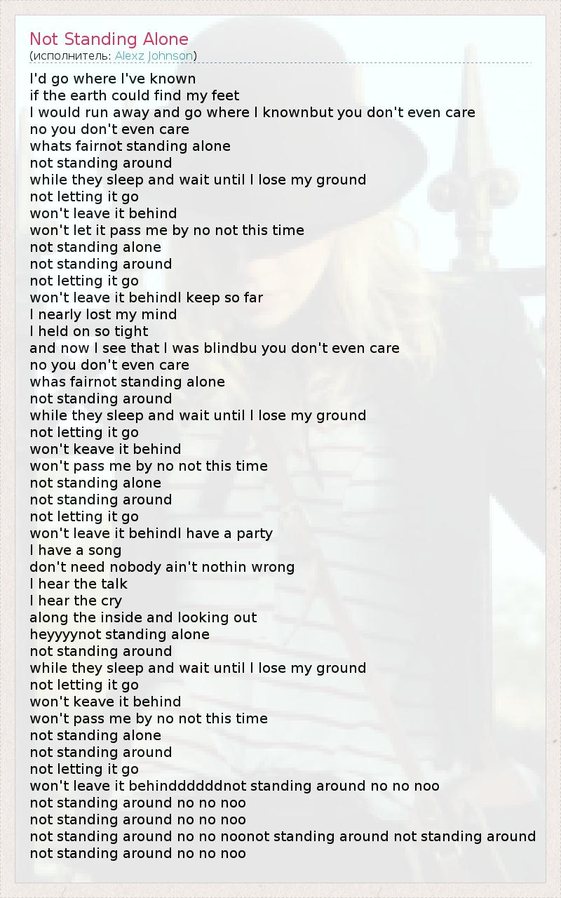 I'd go where I've known if the earth could find my feet I would run away and go where I knownbut you don't even care no you don't even care whats fairnot standing alone not standing around while they sleep and wait until I lose my ground not letting it go won't leave it behind won't let it pass me by no not this time not standing alone not standing around not letting it go won't leave it behindI keep so far I nearly lost my mind I held on so tight and now I see that I was blindbu you don't even care no you don't even care whas fairnot standing alone not standing around while they sleep and wait until I lose my ground not letting it go won't keave it behind won't pass me by no not this time not standing alone not standing around not letting it go won't leave it behindI have a party I have a song don't need nobody ain't nothin wrong I hear the talk I hear the cry along the inside and looking out heyyyynot standing alone not standing around while they sleep and wait until I lose my ground not letting it go won't keave it behind won't pass me by no not this time not standing alone not standing around not letting it go won't leave it behinddddddnot standing around no no noo not standing around no no noo not standing around no no noo not standing around no no noonot standing around not standing around not standing around no no noo