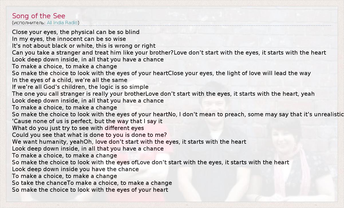 Close your eyes, the physical can be so blind In my eyes, the innocent can be so wise It's not about black or white, this is wrong or right Can you take a stranger and treat him like your brother?Love don't start with the eyes, it starts with the heart Look deep down inside, in all that you have a chance To make a choice, to make a change So make the choice to look with the eyes of your heartClose your eyes, the light of love will lead the way In the eyes of a child, we're all the same If we're all God's children, the logic is so simple The one you call stranger is really your brotherLove don't start with the eyes, it starts with the heart, yeah Look deep down inside, in all that you have a chance To make a choice, to make a change So make the choice to look with the eyes of your heartNo, I don't mean to preach, some may say that it's unrealistic 'Cause none of us is perfect, but the way that I say it What do you just try to see with different eyes Could you see that what is done to you is done to me? We want humanity, yeahOh, love don't start with the eyes, it starts with the heart Look deep down inside, in all that you have a chance To make a choice, to make a change So make the choice to look with the eyes ofLove don't start with the eyes, it starts with the heart Look deep down inside you have the chance To make a choice, to make a change So take the chanceTo make a choice, to make a change So make the choice to look with the eyes of your heart