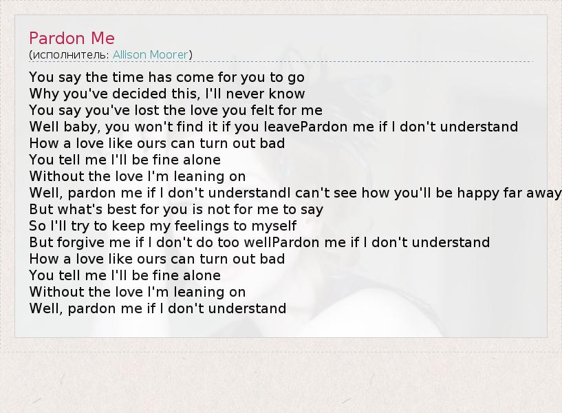 You say the time has come for you to go Why you've decided this, I'll never know You say you've lost the love you felt for me Well baby, you won't find it if you leavePardon me if I don't understand How a love like ours can turn out bad You tell me I'll be fine alone Without the love I'm leaning on Well, pardon me if I don't understandI can't see how you'll be happy far away But what's best for you is not for me to say So I'll try to keep my feelings to myself But forgive me if I don't do too wellPardon me if I don't understand How a love like ours can turn out bad You tell me I'll be fine alone Without the love I'm leaning on Well, pardon me if I don't understand