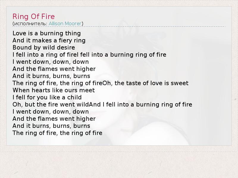 Love is a burning thing And it makes a fiery ring Bound by wild desire I fell into a ring of fireI fell into a burning ring of fire I went down, down, down And the flames went higher And it burns, burns, burns The ring of fire, the ring of fireOh, the taste of love is sweet When hearts like ours meet I fell for you like a child Oh, but the fire went wildAnd I fell into a burning ring of fire I went down, down, down And the flames went higher And it burns, burns, burns The ring of fire, the ring of fire