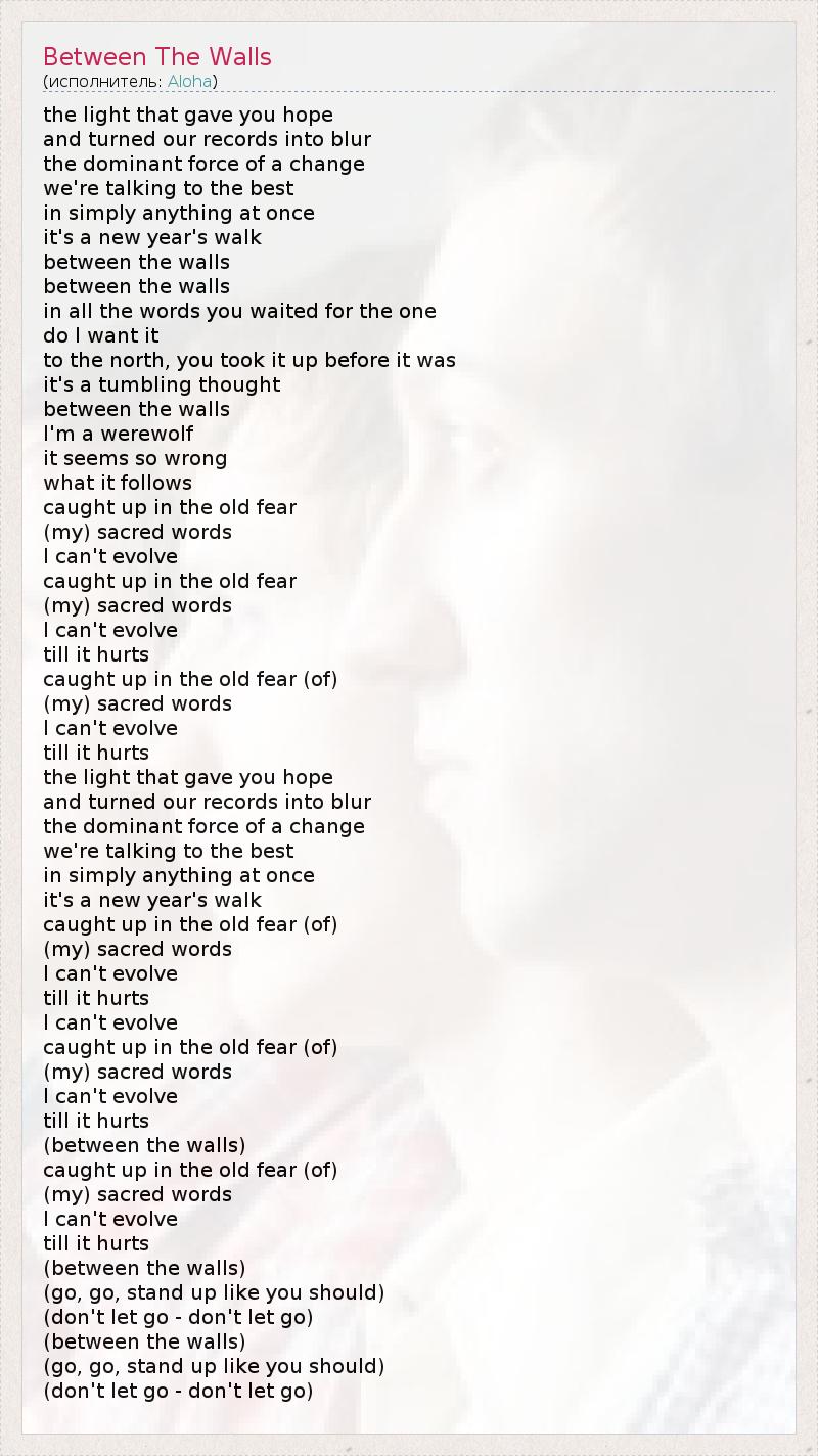 the light that gave you hope and turned our records into blur the dominant force of a change we're talking to the best in simply anything at once it's a new year's walk between the walls between the walls in all the words you waited for the one do I want it to the north, you took it up before it was it's a tumbling thought between the walls I'm a werewolf it seems so wrong what it follows caught up in the old fear (my) sacred words I can't evolve caught up in the old fear (my) sacred words I can't evolve till it hurts caught up in the old fear (of) (my) sacred words I can't evolve till it hurts the light that gave you hope and turned our records into blur the dominant force of a change we're talking to the best in simply anything at once it's a new year's walk caught up in the old fear (of) (my) sacred words I can't evolve till it hurts I can't evolve caught up in the old fear (of) (my) sacred words I can't evolve till it hurts (between the walls) caught up in the old fear (of) (my) sacred words I can't evolve till it hurts (between the walls) (go, go, stand up like you should) (don't let go - don't let go) (between the walls) (go, go, stand up like you should) (don't let go - don't let go)