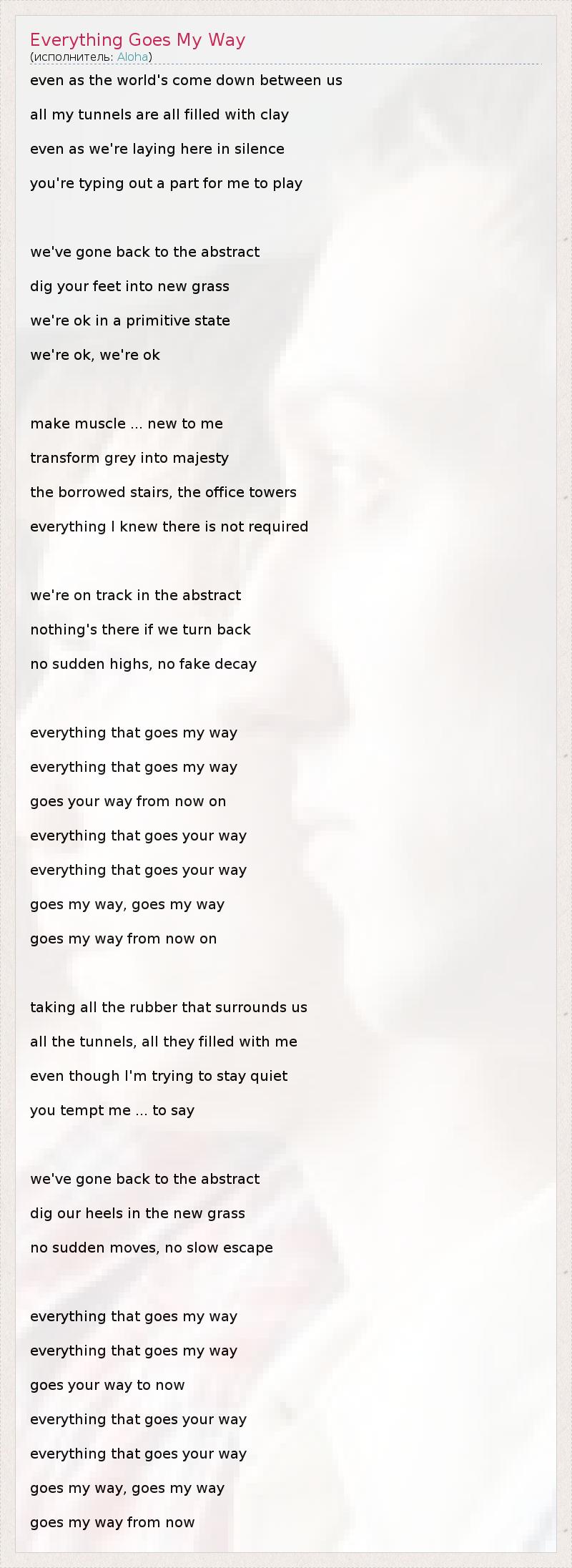 even as the world's come down between us all my tunnels are all filled with clay even as we're laying here in silence you're typing out a part for me to play we've gone back to the abstract dig your feet into new grass we're ok in a primitive state we're ok, we're ok make muscle ... new to me transform grey into majesty the borrowed stairs, the office towers everything I knew there is not required we're on track in the abstract nothing's there if we turn back no sudden highs, no fake decay everything that goes my way everything that goes my way goes your way from now on everything that goes your way everything that goes your way goes my way, goes my way goes my way from now on taking all the rubber that surrounds us all the tunnels, all they filled with me even though I'm trying to stay quiet you tempt me ... to say we've gone back to the abstract dig our heels in the new grass no sudden moves, no slow escape everything that goes my way everything that goes my way goes your way to now everything that goes your way everything that goes your way goes my way, goes my way goes my way from now