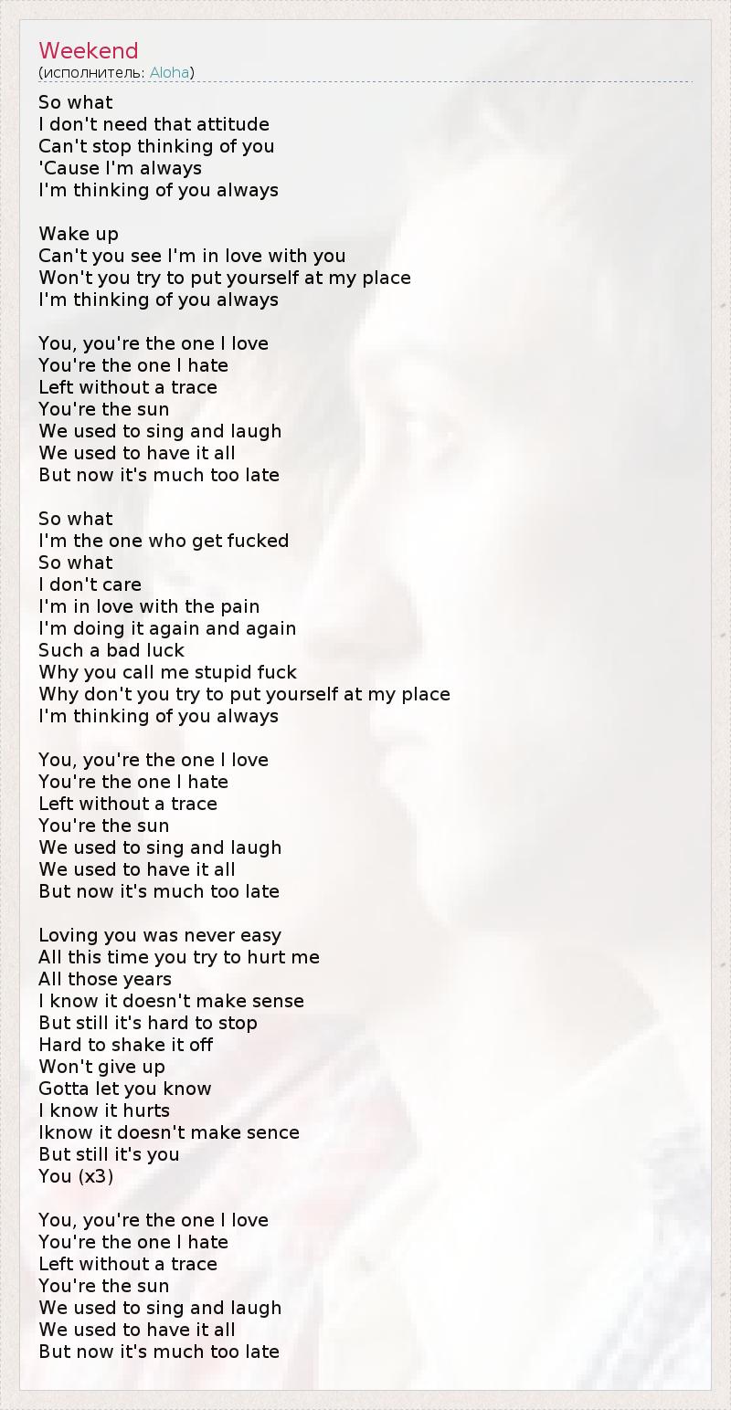 И что же? Мне не нужно такое отношение, Но я не могу перестать думать о тебе, Потому что я всегда, Я думаю о тебе постоянно... Осмотрись! Неужели не замечаешь, что я влюблена в тебя? Не хочешь ли поставить себя на мое место? Я думаю о тебе постоянно.... Ты, ты единственный, кого я люблю, Ты, ты единственный, кого я ненавижу... Ты ушел без следа, Ты - мое солнце, Мы пели и смеялись.. У нас было всё.. Но уже слишком поздно... И что же? Меня просто обманули! И что же? Мне всё равно! Я влюблена в боль, Я повторяю это вновь и вновь... Это просто неудача, Почему ты называешь меня глупой? Не хочешь ли поставить себя на мое место? Я думаю о тебе постоянно... Ты, ты единственный, кого я люблю, Ты, ты единственный, кого я ненавижу... Ты ушел без следа, Ты - мое солнце, Мы пели и смеялись.. У нас было всё.. Но уже слишком поздно... Любить тебя очень сложно... Все это время ты причинял мне боль, Все эти годы... Я знаю, это бессмысленно, Но я не могу остановиться, Я не могу... сложно отпустить тебя, Я не сделаю этого... Я просто хочу, чтобы ты знал: Я знаю, что это больно, Я знаю, что это бессмысленно, Но всё-таки это ты... Ты (х3) Ты, ты единственный, кого я люблю, Ты, ты единственный, кого я ненавижу... Ты ушел без следа, Ты - мое солнце, Мы пели и смеялись.. У нас было всё.. Но уже слишком поздно...