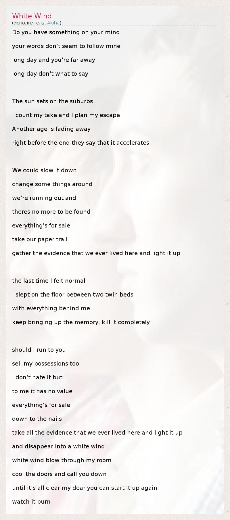 Do you have something on your mind your words don't seem to follow mine long day and you're far away long day don't what to say The sun sets on the suburbs I count my take and I plan my escape Another age is fading away right before the end they say that it accelerates We could slow it down change some things around we're running out and theres no more to be found everything's for sale take our paper trail gather the evidence that we ever lived here and light it up the last time I felt normal I slept on the floor between two twin beds with everything behind me keep bringing up the memory, kill it completely should I run to you sell my possessions too I don't hate it but to me it has no value everything's for sale down to the nails take all the evidence that we ever lived here and light it up and disappear into a white wind white wind blow through my room cool the doors and call you down until it's all clear my dear you can start it up again watch it burn