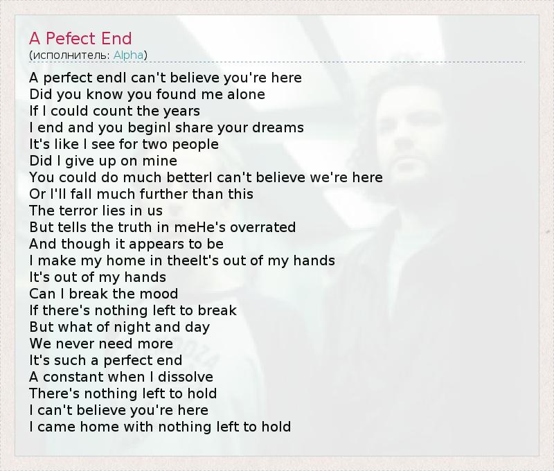 A perfect endI can't believe you're here Did you know you found me alone If I could count the years I end and you beginI share your dreams It's like I see for two people Did I give up on mine You could do much betterI can't believe we're here Or I'll fall much further than this The terror lies in us But tells the truth in meHe's overrated And though it appears to be I make my home in theeIt's out of my hands It's out of my hands Can I break the mood If there's nothing left to break But what of night and day We never need more It's such a perfect end A constant when I dissolve There's nothing left to hold I can't believe you're here I came home with nothing left to hold