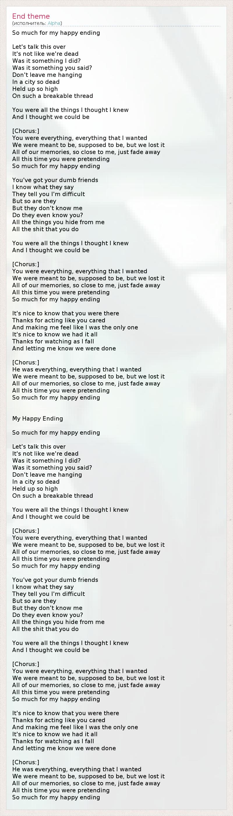 So much for my happy ending Let's talk this over It's not like we're dead Was it something I did? Was it something you said? Don't leave me hanging In a city so dead Held up so high On such a breakable thread You were all the things I thought I knew And I thought we could be [Chorus:] You were everything, everything that I wanted We were meant to be, supposed to be, but we lost it All of our memories, so close to me, just fade away All this time you were pretending So much for my happy ending You've got your dumb friends I know what they say They tell you I'm difficult But so are they But they don't know me Do they even know you? All the things you hide from me All the shit that you do You were all the things I thought I knew And I thought we could be [Chorus:] You were everything, everything that I wanted We were meant to be, supposed to be, but we lost it All of our memories, so close to me, just fade away All this time you were pretending So much for my happy ending It's nice to know that you were there Thanks for acting like you cared And making me feel like I was the only one It's nice to know we had it all Thanks for watching as I fall And letting me know we were done [Chorus:] He was everything, everything that I wanted We were meant to be, supposed to be, but we lost it All of our memories, so close to me, just fade away All this time you were pretending So much for my happy ending My Happy Ending So much for my happy ending Let's talk this over It's not like we're dead Was it something I did? Was it something you said? Don't leave me hanging In a city so dead Held up so high On such a breakable thread You were all the things I thought I knew And I thought we could be [Chorus:] You were everything, everything that I wanted We were meant to be, supposed to be, but we lost it All of our memories, so close to me, just fade away All this time you were pretending So much for my happy ending You've got your dumb friends I know what they say They tell you I'm difficult But so are they But they don't know me Do they even know you? All the things you hide from me All the shit that you do You were all the things I thought I knew And I thought we could be [Chorus:] You were everything, everything that I wanted We were meant to be, supposed to be, but we lost it All of our memories, so close to me, just fade away All this time you were pretending So much for my happy ending It's nice to know that you were there Thanks for acting like you cared And making me feel like I was the only one It's nice to know we had it all Thanks for watching as I fall And letting me know we were done [Chorus:] He was everything, everything that I wanted We were meant to be, supposed to be, but we lost it All of our memories, so close to me, just fade away All this time you were pretending So much for my happy ending