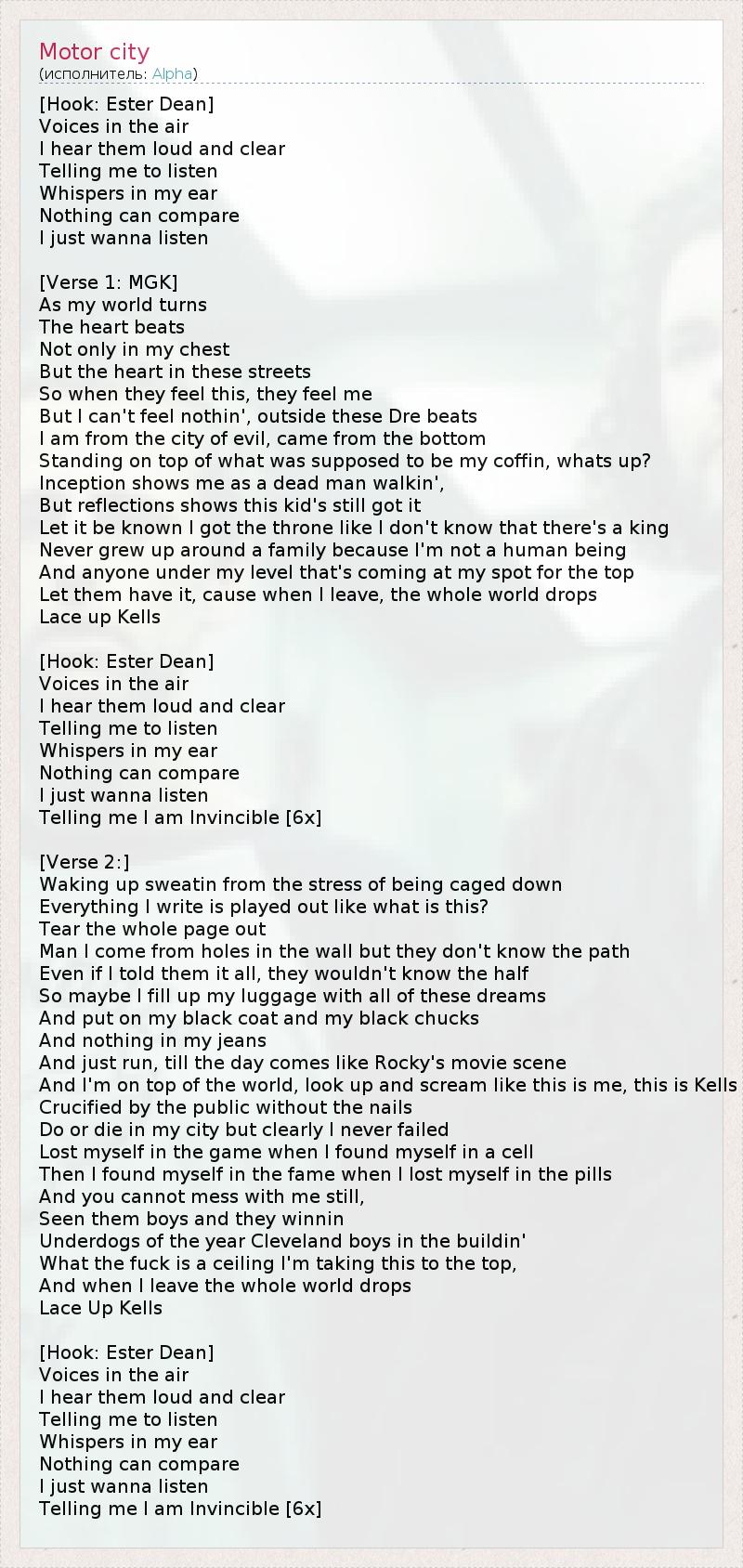 [Хук: Ester Dean] Голоса вокруг – Я слышу их четко и ясно. Они велят мне слушать, Нашептывают в уши. С этим ничто не сравнится. Я просто хочу слушать. [1 куплет: MGK] Мой мир вращается, И мое сердце бьется, Но не только в моей груди. Моё сердце – на этих улицах. Поэтому когда люди чувствуют его биение, они чувствуют меня. Но сам я ничего не чувствую, когда на мне наушники от Дре. 1 Я из города зла, я поднялся с самых низов. Стою на вершине того, что должно было угробить меня: чё каво? Начало показало мне, как ходят живые мертвецы, Но мысли подсказывали: "Парень, всё в твоих руках". Пусть знают: я завладел троном, как будто не знал, что есть король. Я никогда не рос в кругу семьи, потому что я не такой, как все остальные. Каждый, кто мне не ровня, пытается занять мое место на самом верху. Пусть только попробуют, потому что если меня не будет, весь мир рухнет. Наяривай, Kells! [Хук: Ester Dean] Голоса вокруг – Я слышу их четко и ясно. Они велят мне слушать, Нашептывают в уши. С этим ничто не сравнится. Я просто хочу слушать. Они говорят мне, что я непобедим. [6x] [2 куплет:] Я шел наверх, обливаясь семью потами под бременем жизни в клетке. Всё, что я писал, никуда не годилось и было из серии: "Это еще что такое?" Я рвал всё в клочья. Приятель, я появился, как черт из табакерки, но никто не знает, через что я прошел. Даже если я обо всём расскажу, никто не испытал и половины из этого. Так, может быть, пускай мои мечты станут моим багажом? Я надену свой черный плащ, свои черные кеды, Оставив карманы джинсов пустыми, И просто буду бежать, пока не наступит утро, как в фильме "Рокки". 2 И вот я на вершине мира, я поднимаю глаза и кричу: "Это я! Это Kells!" А сам – распят публикой без гвоздей. В моем городе – либо пан, либо пропал. Но я никогда не падал. Я потерял себя в рэпе и оказался в тюрьме, Потом проснулся знаменитым, но терял себя, сидя на "колёсах". Вы до сих пор меня не обошли. Посмотрите на этих парней: они победители. 3 Неудачники года, парни из Кливленда, поприветствуем их! Какие, к ч*рту, пределы? Я забрался на самый верх! И если меня не будет, весь мир рухнет. Наяривай, Kells! [Хук: Ester Dean] Голоса вокруг – Я слышу их четко и ясно. Они велят мне слушать, Нашептывают в уши. С этим ничто не сравнится. Я просто хочу слушать. Они говорят мне, что я непобедим. [6x] 1 – Beats by Dr. Dre – бренд наушников, основанный американским рэпером Dr Dre. 2 – Имеется в виду сцена изнурительных тренировок из одного из фильмов про боксера Рокки Бальбоа. 3 – Имеется в виду команда, работающая с MGK.