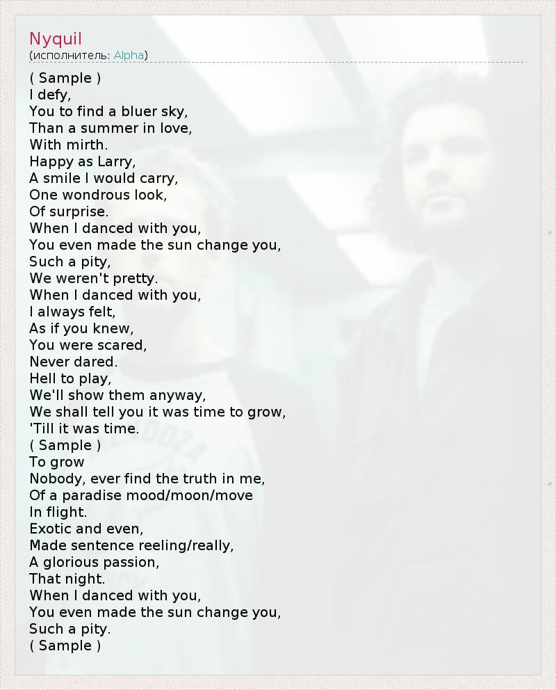 ( Sample ) I defy, You to find a bluer sky, Than a summer in love, With mirth. Happy as Larry, A smile I would carry, One wondrous look, Of surprise. When I danced with you, You even made the sun change you, Such a pity, We weren't pretty. When I danced with you, I always felt, As if you knew, You were scared, Never dared. Hell to play, We'll show them anyway, We shall tell you it was time to grow, 'Till it was time. ( Sample ) To grow Nobody, ever find the truth in me, Of a paradise mood/moon/move In flight. Exotic and even, Made sentence reeling/really, A glorious passion, That night. When I danced with you, You even made the sun change you, Such a pity. ( Sample )