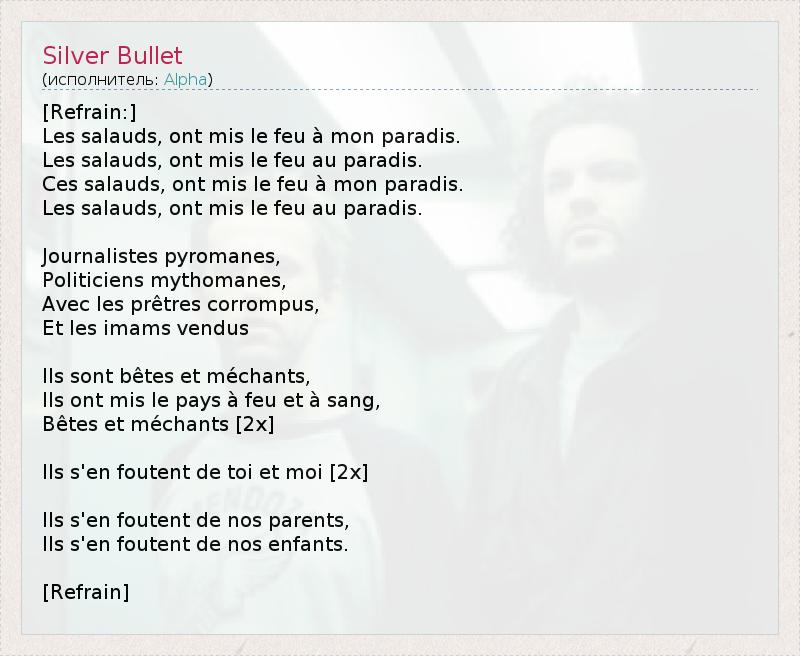 [Refrain:] Les salauds, ont mis le feu à mon paradis. Les salauds, ont mis le feu au paradis. Ces salauds, ont mis le feu à mon paradis. Les salauds, ont mis le feu au paradis. Journalistes pyromanes, Politiciens mythomanes, Avec les prêtres corrompus, Et les imams vendus Ils sont bêtes et méchants, Ils ont mis le pays à feu et à sang, Bêtes et méchants [2x] Ils s'en foutent de toi et moi [2x] Ils s'en foutent de nos parents, Ils s'en foutent de nos enfants. [Refrain]