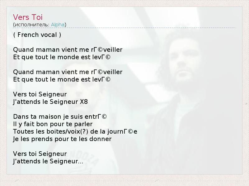 ( French vocal ) Quand maman vient me rГ©veiller Et que tout le monde est levГ© Quand maman vient me rГ©veiller Et que tout le monde est levГ© Vers toi Seigneur J'attends le Seigneur X8 Dans ta maison je suis entrГ© Il y fait bon pour te parler Toutes les boites/voix(?) de la journГ©e Je les prends pour te les donner Vers toi Seigneur J'attends le Seigneur...