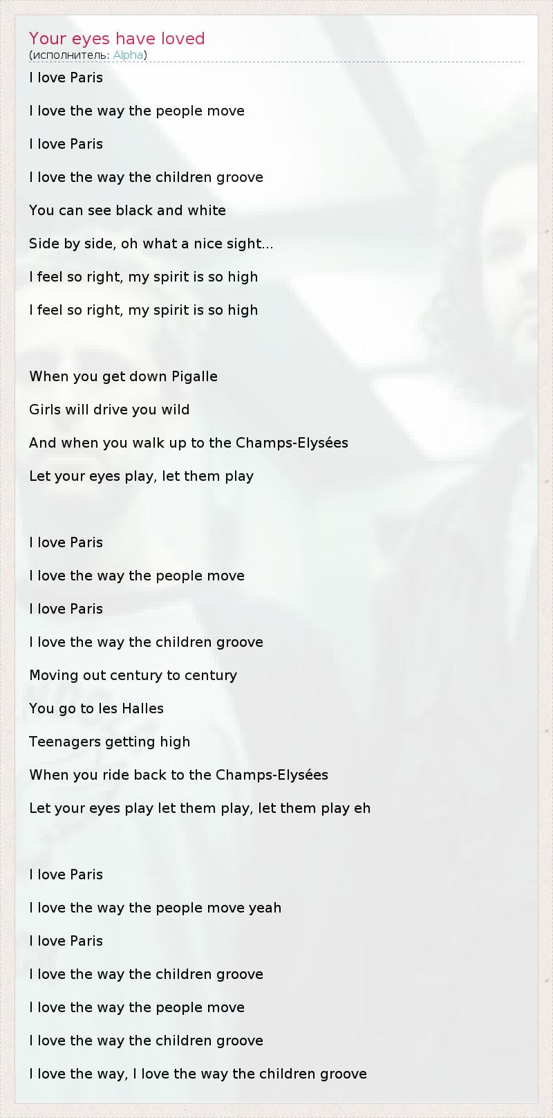 I love Paris I love the way the people move I love Paris I love the way the children groove You can see black and white Side by side, oh what a nice sight... I feel so right, my spirit is so high I feel so right, my spirit is so high When you get down Pigalle Girls will drive you wild And when you walk up to the Champs-Elysées Let your eyes play, let them play I love Paris I love the way the people move I love Paris I love the way the children groove Moving out century to century You go to les Halles Teenagers getting high When you ride back to the Champs-Elysées Let your eyes play let them play, let them play eh I love Paris I love the way the people move yeah I love Paris I love the way the children groove I love the way the people move I love the way the children groove I love the way, I love the way the children groove