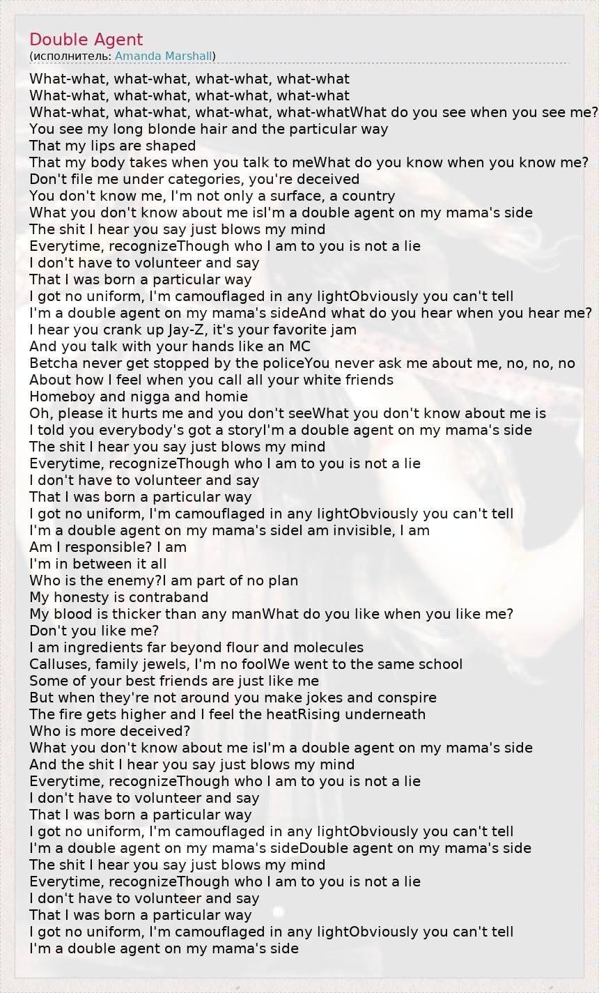 What-what, what-what, what-what, what-what What-what, what-what, what-what, what-what What-what, what-what, what-what, what-whatWhat do you see when you see me? You see my long blonde hair and the particular way That my lips are shaped That my body takes when you talk to meWhat do you know when you know me? Don't file me under categories, you're deceived You don't know me, I'm not only a surface, a country What you don't know about me isI'm a double agent on my mama's side The shit I hear you say just blows my mind Everytime, recognizeThough who I am to you is not a lie I don't have to volunteer and say That I was born a particular way I got no uniform, I'm camouflaged in any lightObviously you can't tell I'm a double agent on my mama's sideAnd what do you hear when you hear me? I hear you crank up Jay-Z, it's your favorite jam And you talk with your hands like an MC Betcha never get stopped by the policeYou never ask me about me, no, no, no About how I feel when you call all your white friends Homeboy and nigga and homie Oh, please it hurts me and you don't seeWhat you don't know about me is I told you everybody's got a storyI'm a double agent on my mama's side The shit I hear you say just blows my mind Everytime, recognizeThough who I am to you is not a lie I don't have to volunteer and say That I was born a particular way I got no uniform, I'm camouflaged in any lightObviously you can't tell I'm a double agent on my mama's sideI am invisible, I am Am I responsible? I am I'm in between it all Who is the enemy?I am part of no plan My honesty is contraband My blood is thicker than any manWhat do you like when you like me? Don't you like me? I am ingredients far beyond flour and molecules Calluses, family jewels, I'm no foolWe went to the same school Some of your best friends are just like me But when they're not around you make jokes and conspire The fire gets higher and I feel the heatRising underneath Who is more deceived? What you don't know about me isI'm a double agent on my mama's side And the shit I hear you say just blows my mind Everytime, recognizeThough who I am to you is not a lie I don't have to volunteer and say That I was born a particular way I got no uniform, I'm camouflaged in any lightObviously you can't tell I'm a double agent on my mama's sideDouble agent on my mama's side The shit I hear you say just blows my mind Everytime, recognizeThough who I am to you is not a lie I don't have to volunteer and say That I was born a particular way I got no uniform, I'm camouflaged in any lightObviously you can't tell I'm a double agent on my mama's side
