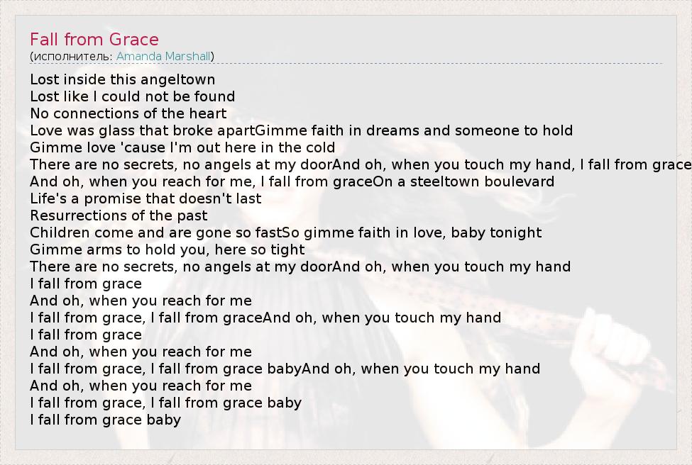Lost inside this angeltown Lost like I could not be found No connections of the heart Love was glass that broke apartGimme faith in dreams and someone to hold Gimme love 'cause I'm out here in the cold There are no secrets, no angels at my doorAnd oh, when you touch my hand, I fall from grace And oh, when you reach for me, I fall from graceOn a steeltown boulevard Life's a promise that doesn't last Resurrections of the past Children come and are gone so fastSo gimme faith in love, baby tonight Gimme arms to hold you, here so tight There are no secrets, no angels at my doorAnd oh, when you touch my hand I fall from grace And oh, when you reach for me I fall from grace, I fall from graceAnd oh, when you touch my hand I fall from grace And oh, when you reach for me I fall from grace, I fall from grace babyAnd oh, when you touch my hand And oh, when you reach for me I fall from grace, I fall from grace baby I fall from grace baby