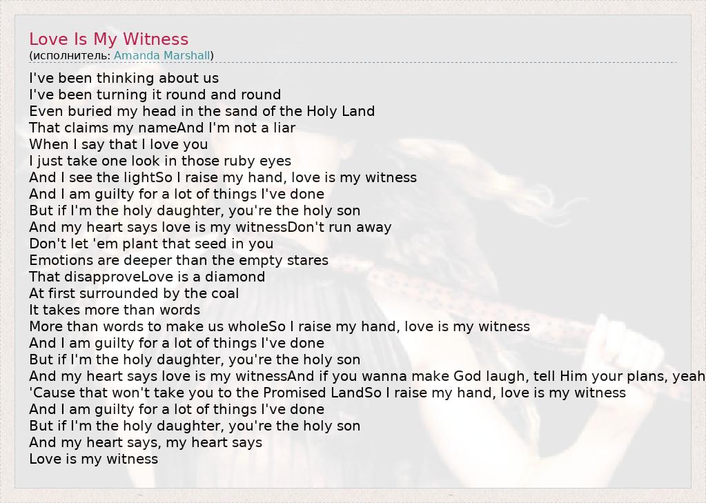 I've been thinking about us I've been turning it round and round Even buried my head in the sand of the Holy Land That claims my nameAnd I'm not a liar When I say that I love you I just take one look in those ruby eyes And I see the lightSo I raise my hand, love is my witness And I am guilty for a lot of things I've done But if I'm the holy daughter, you're the holy son And my heart says love is my witnessDon't run away Don't let 'em plant that seed in you Emotions are deeper than the empty stares That disapproveLove is a diamond At first surrounded by the coal It takes more than words More than words to make us wholeSo I raise my hand, love is my witness And I am guilty for a lot of things I've done But if I'm the holy daughter, you're the holy son And my heart says love is my witnessAnd if you wanna make God laugh, tell Him your plans, yeah 'Cause that won't take you to the Promised LandSo I raise my hand, love is my witness And I am guilty for a lot of things I've done But if I'm the holy daughter, you're the holy son And my heart says, my heart says Love is my witness