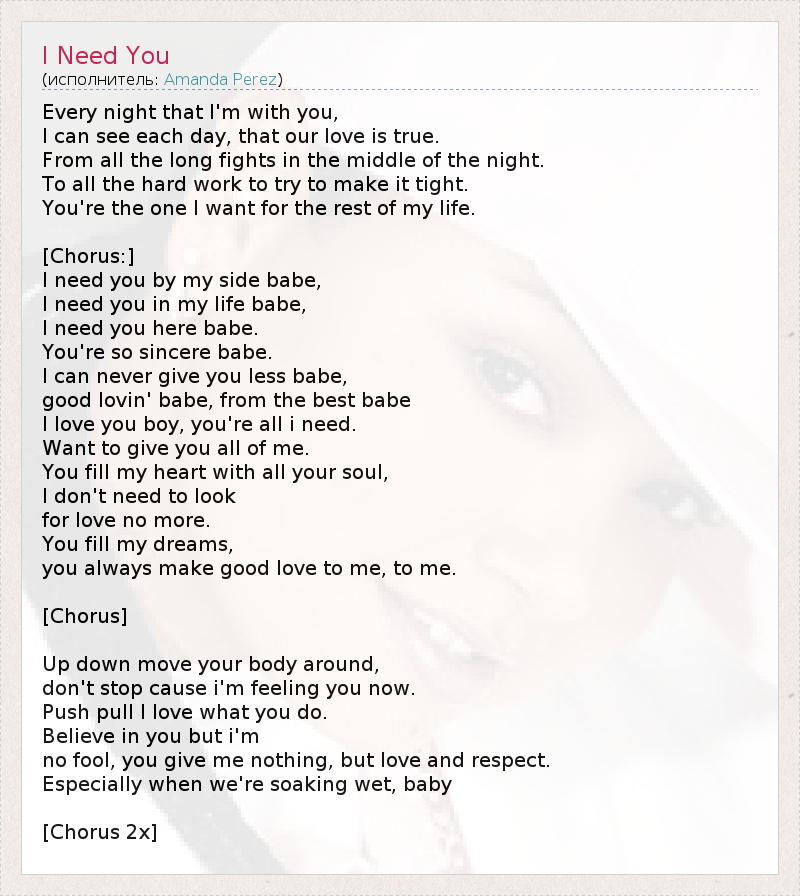 Every night that I'm with you, I can see each day, that our love is true. From all the long fights in the middle of the night. To all the hard work to try to make it tight. You're the one I want for the rest of my life. [Chorus:] I need you by my side babe, I need you in my life babe, I need you here babe. You're so sincere babe. I can never give you less babe, good lovin' babe, from the best babe I love you boy, you're all i need. Want to give you all of me. You fill my heart with all your soul, I don't need to look for love no more. You fill my dreams, you always make good love to me, to me. [Chorus] Up down move your body around, don't stop cause i'm feeling you now. Push pull I love what you do. Believe in you but i'm no fool, you give me nothing, but love and respect. Especially when we're soaking wet, baby [Chorus 2x]